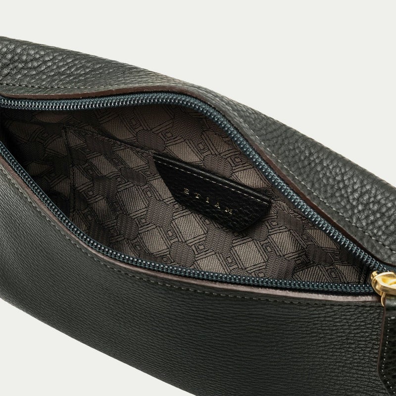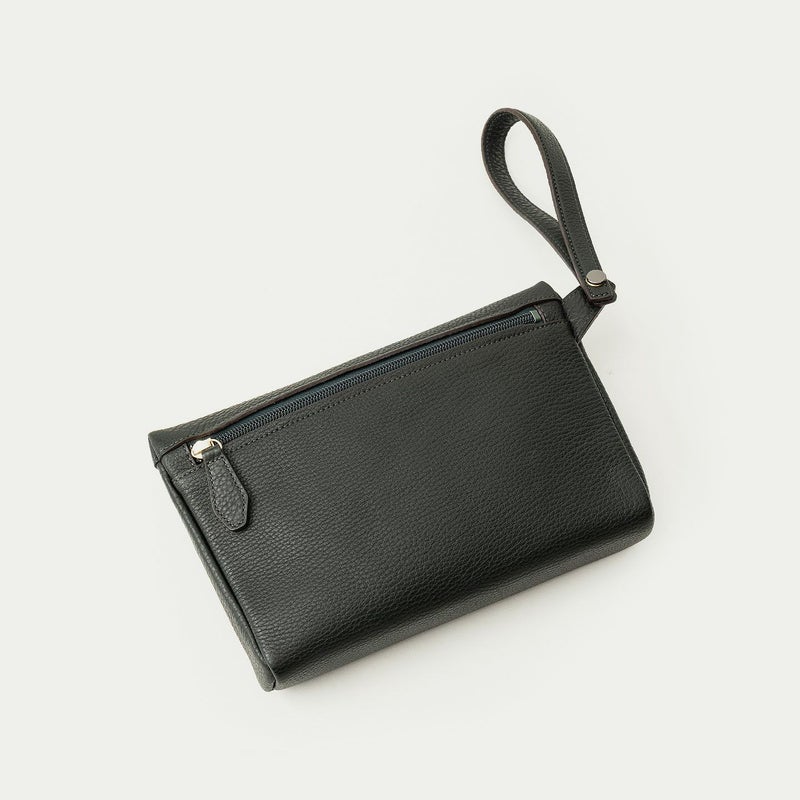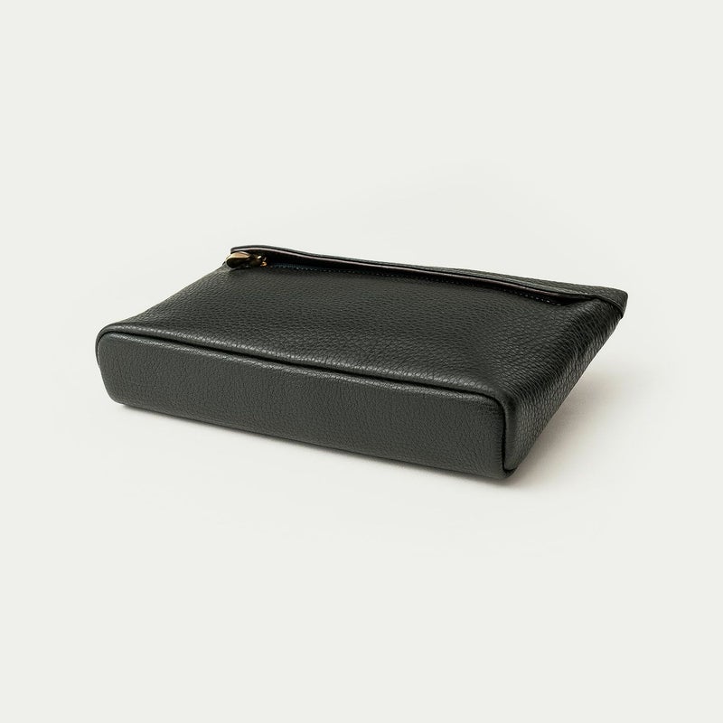 コンパクトながらも長財布を収納できるサイズ感で、ストラップを手首に引っ掛けたり手持ちしたりしながら、軽やかに素早く持ち歩いて行けるポーチ。スポンジ状の芯材を使用することで、外装の「シュリンクレザー」にも程よい弾力を与えて、美しいシルエットを保ちつつ上品なコーディネートができるとともに、収納している貴重品を守る緩衝材の役割も担っています。また、メインポケットの開口を背面にした内縫いの構造にすることで、ふっくらと丸みを帯びたボディを印象的に。背面のファスナーも金属ではなくコイルファスナーにして、「シュリンクレザー」を覆わせているので、カジュアル過ぎない見た目ととともに、手で抱えたときに摩擦で洋服を痛めない配慮も叶えています。