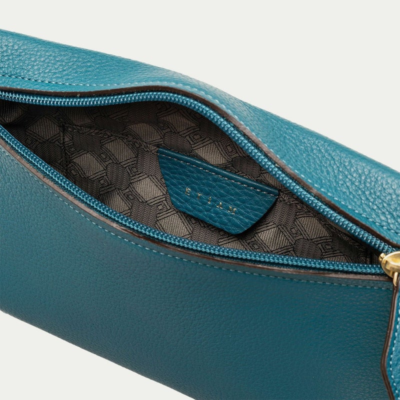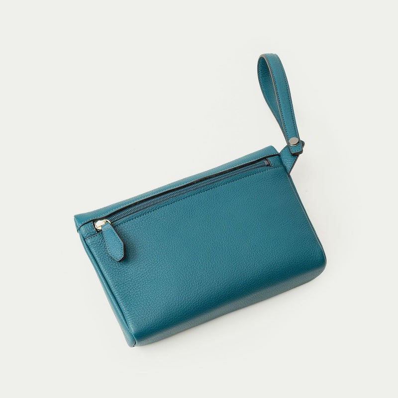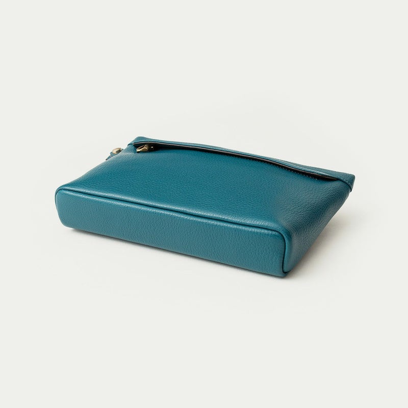 コンパクトながらも長財布を収納できるサイズ感で、ストラップを手首に引っ掛けたり手持ちしたりしながら、軽やかに素早く持ち歩いて行けるポーチ。スポンジ状の芯材を使用することで、外装の「シュリンクレザー」にも程よい弾力を与えて、美しいシルエットを保ちつつ上品なコーディネートができるとともに、収納している貴重品を守る緩衝材の役割も担っています。また、メインポケットの開口を背面にした内縫いの構造にすることで、ふっくらと丸みを帯びたボディを印象的に。背面のファスナーも金属ではなくコイルファスナーにして、「シュリンクレザー」を覆わせているので、カジュアル過ぎない見た目ととともに、手で抱えたときに摩擦で洋服を痛めない配慮も叶えています。