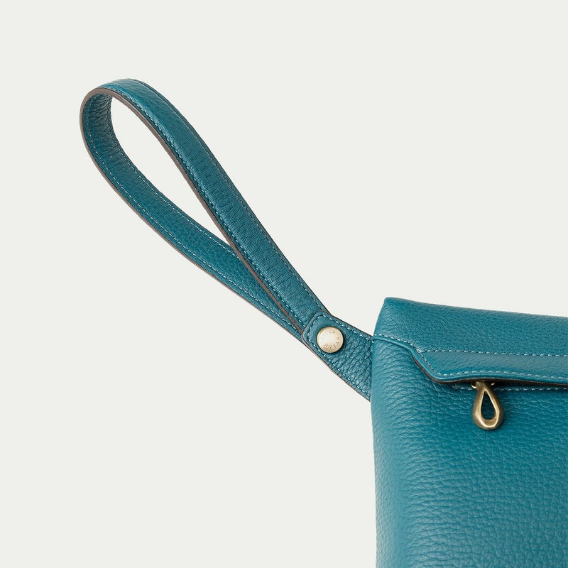 スマートフォンをしっかりと入れられる容量を備えた前面のファスナー式ポケットは、フラップのコバをシャープな焦げ茶色にすることで、愛らしいフォルムを際立たせる直線のシャープなバランスを追求。同じカラーのコバで統一させたストラップは、カフスボタンを想わせるオリジナル真鍮金具の接続で角度を調整でき、使わないときには背面に回したり、旅行・出張などでバッグインバッグとして携帯していてもキレイに収納できたり、軽快に携えて行けます。
