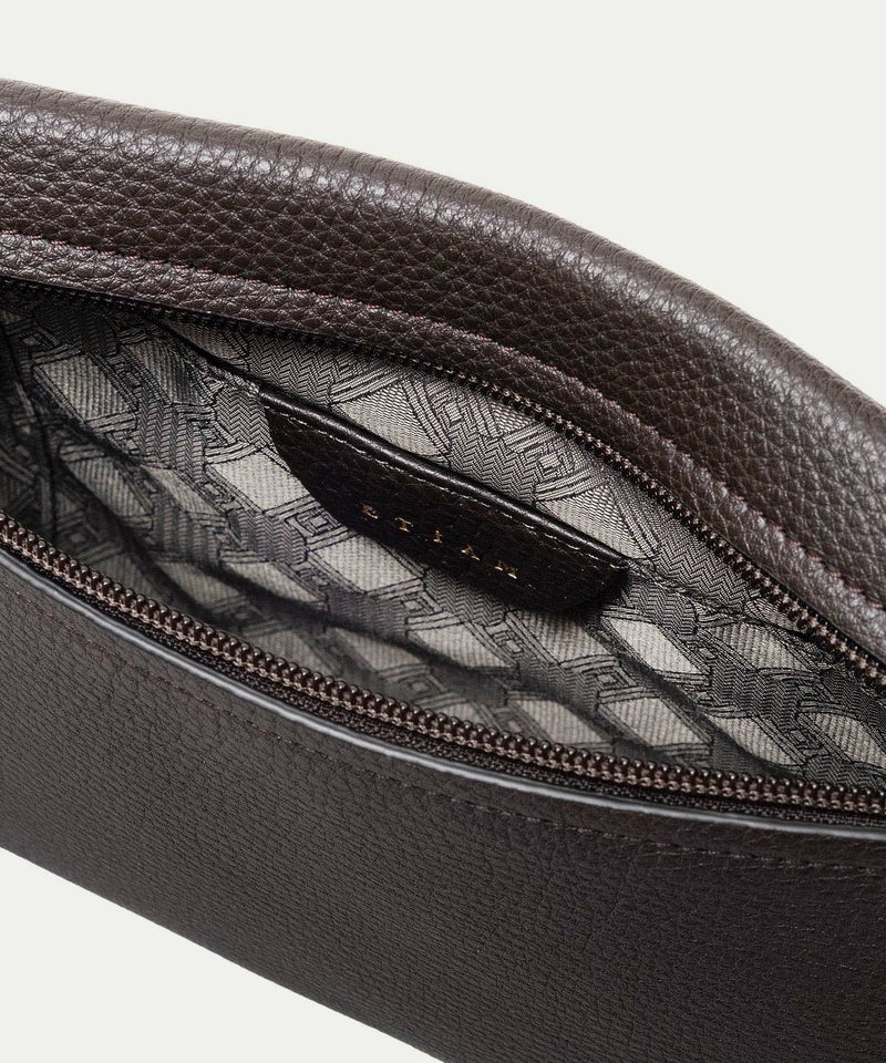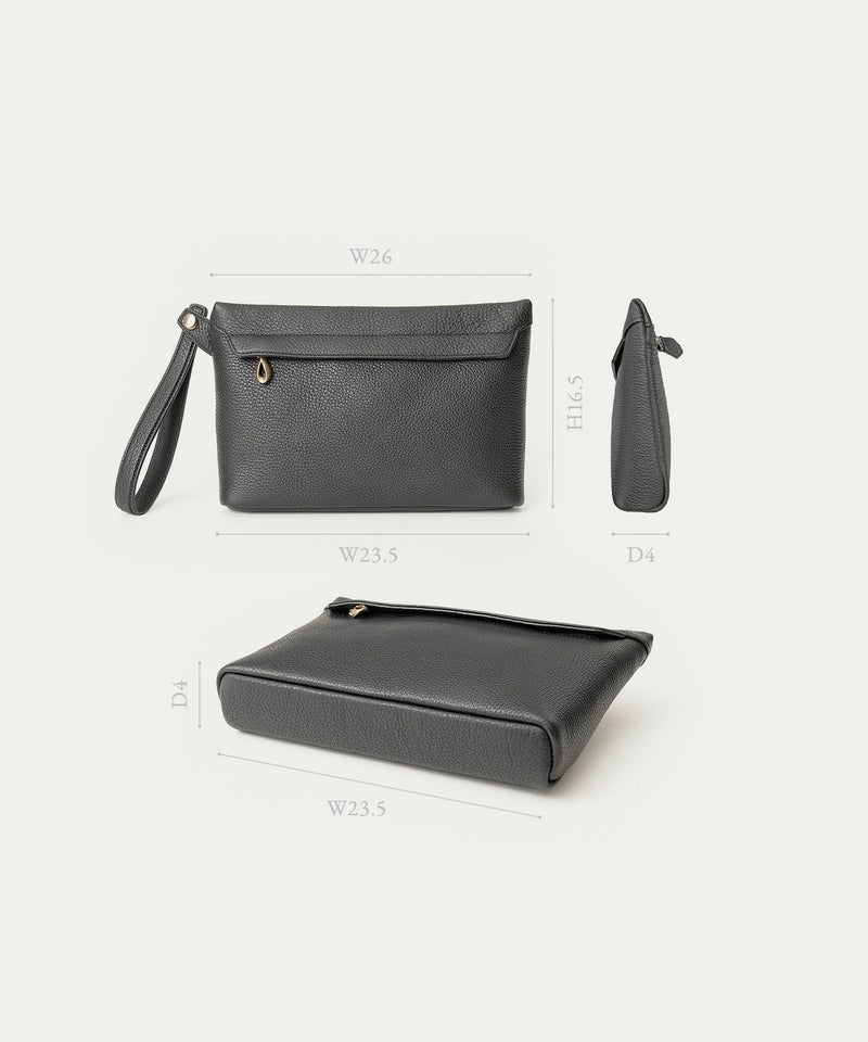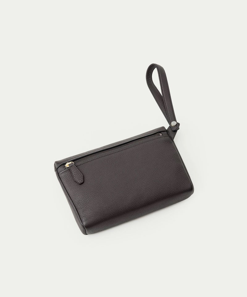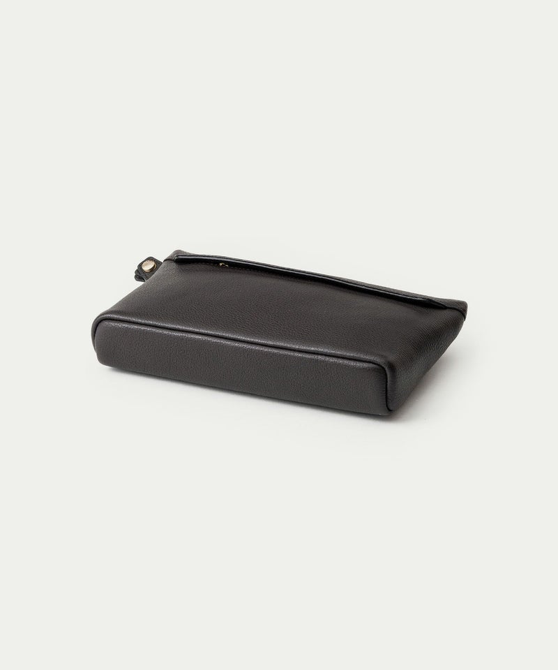 コンパクトながらも長財布を収納できるサイズ感で、ストラップを手首に引っ掛けたり手持ちしたりしながら、軽やかに素早く持ち歩いて行けるポーチ。スポンジ状の芯材を使用することで、外装の「シュリンクレザー」にも程よい弾力を与えて、美しいシルエットを保ちつつ上品なコーディネートができるとともに、収納している貴重品を守る緩衝材の役割も担っています。また、メインポケットの開口を背面にした内縫いの構造にすることで、ふっくらと丸みを帯びたボディを印象的に。背面のファスナーも金属ではなくコイルファスナーにして、「シュリンクレザー」を覆わせているので、カジュアル過ぎない見た目ととともに、手で抱えたときに摩擦で洋服を痛めない配慮も叶えています。