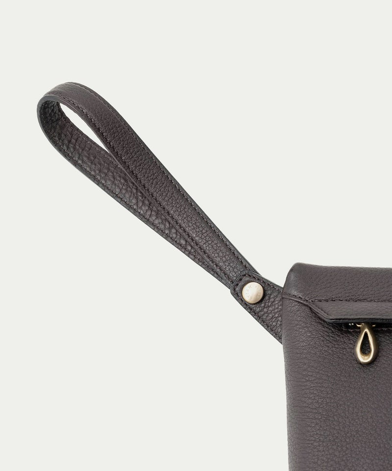 スマートフォンをしっかりと入れられる容量を備えた前面のファスナー式ポケットは、フラップのコバをシャープな焦げ茶色にすることで、愛らしいフォルムを際立たせる直線のシャープなバランスを追求。同じカラーのコバで統一させたストラップは、カフスボタンを想わせるオリジナル真鍮金具の接続で角度を調整でき、使わないときには背面に回したり、旅行・出張などでバッグインバッグとして携帯していてもキレイに収納できたり、軽快に携えて行けます。