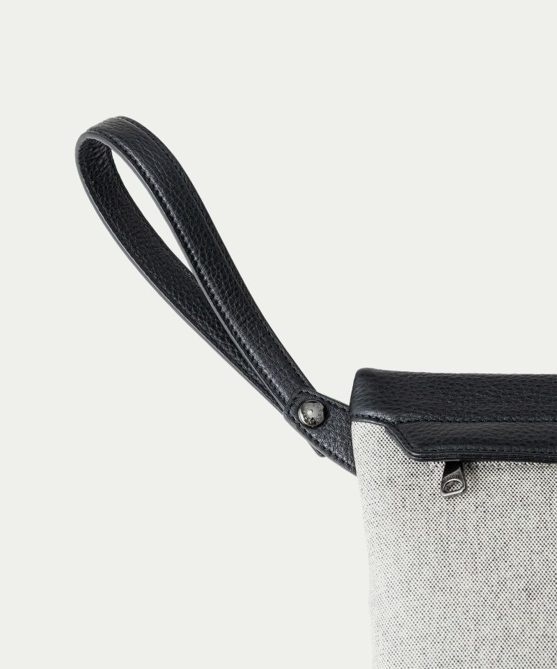 スポーティーでありながらエレガンスを忘れない “エレガンテ・スポルティーヴォ”を、コンセプトにしているブランドのライダースジャケットに合う、クラッチバッグほど堅苦しくなく、一般的なポーチほど簡易的すぎない、洗練されたカジュアルなアイテムへと昇華。奥行き感のあるマットな仕上げのメイン素材「キャンバス生地」を駆使し、全面&側面・背面&底面を一枚で繋げることで、ソフトで丸みを帯びたフォルムへと導いています。「キャンバス生地」と「シュリンクレザー」の裏面に弾力のある芯材を用いることで、柔らかいながらもハリがあり、型崩れもしにくく、キレイな状態を長く保てる工夫をしています。