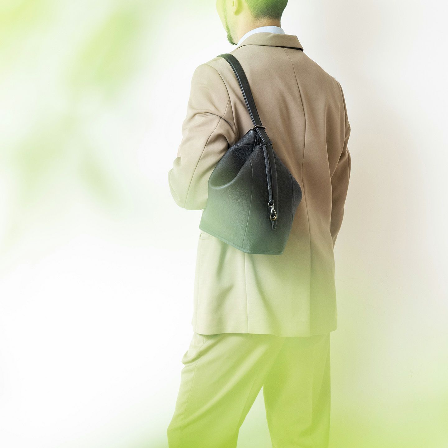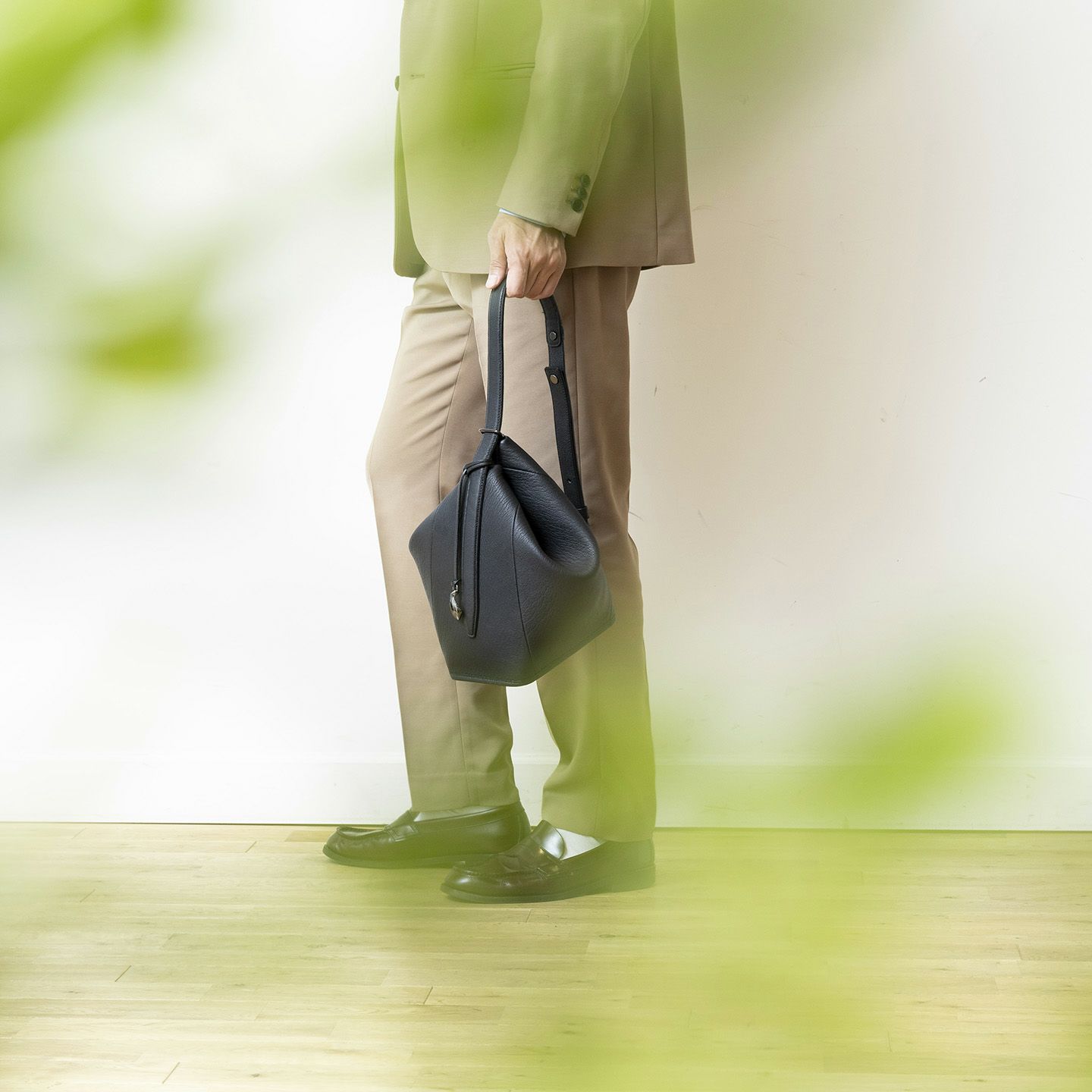 大人カジュアルな魅力を輝かせながら、巾着のようにユニークなフォルムのまま、相棒のように気軽に連れて行ける、新たな価値観を追求したハンド&スリングバッグ。横幅25mmもある肉厚のレザーベルトの長さを調整することで、指や腕に引っ掛けて連れて行くスタイルと、ワンショルダーの肩掛けで連れて行くスタイルの2WAYを楽しむことができます。