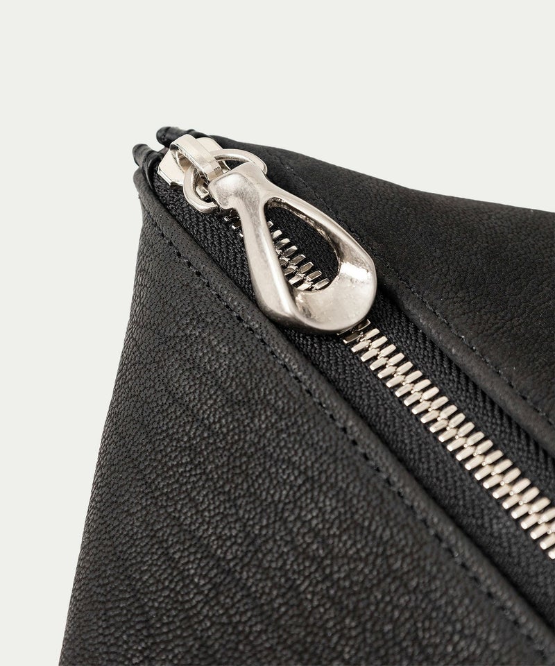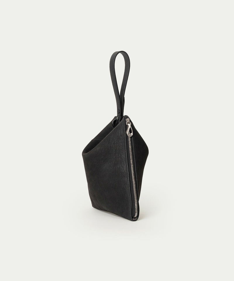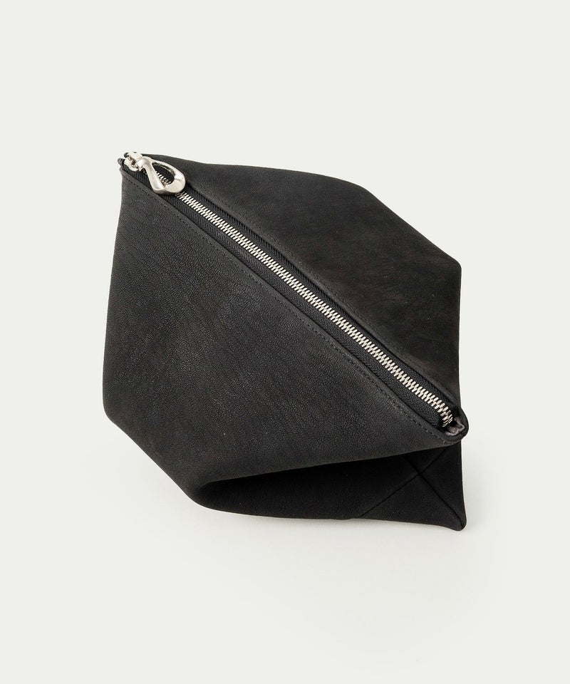 しっとりとした手触りと上品な起毛感が魅力で、牛革より軽く表面に撥水加工を施したゴートレザー「ヌバック」のボディに、柔らかくて程よいハリのある芯材を用いることで、型崩れしにくくキレイな形状のまま長く使いこなせるのも魅力。ハギ(繋ぎ目)は、前面センターに入れるのではなく、あえて両サイド斜めに設けることで、上部の三角形を生かした菱形のエレガントな印象へ。ゴートレザーのストラップは、接続金具を軸にフレキシブルに回転し、軽やかに手首に通して持ち歩くことができます。