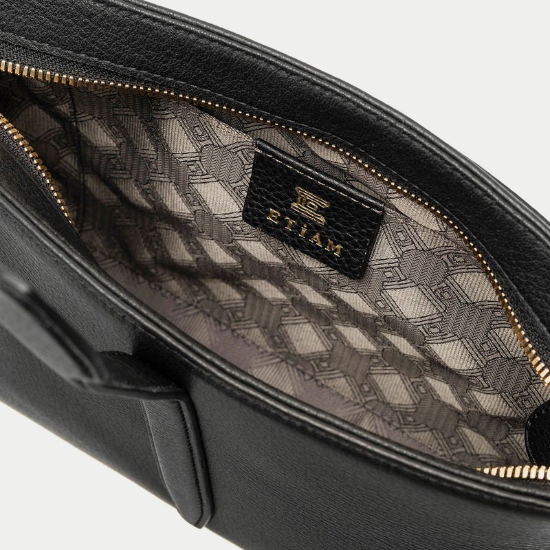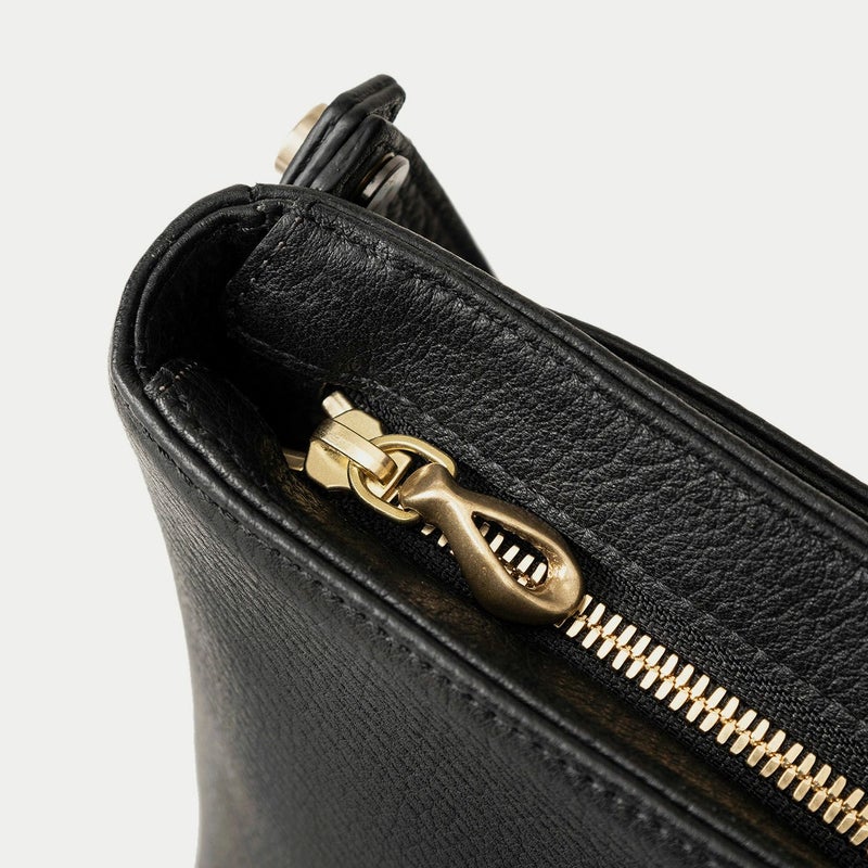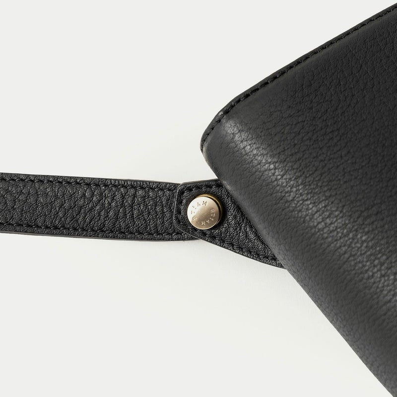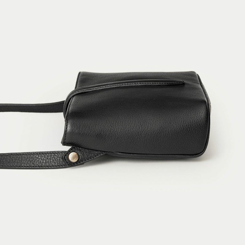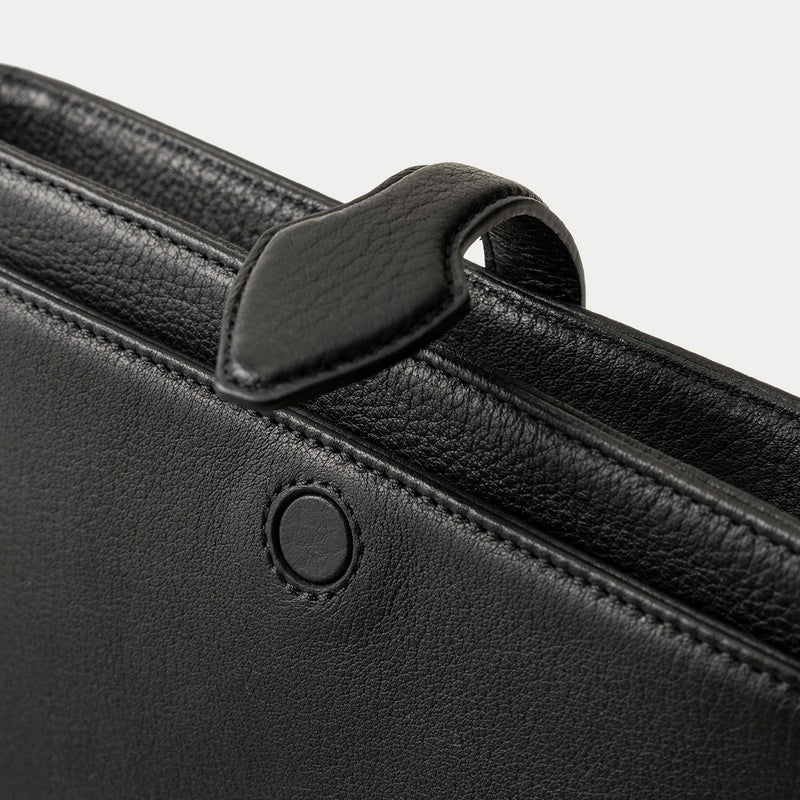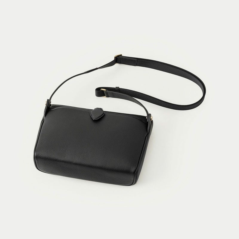 気持ちと姿勢を正してくれるようなイメージを抱く、前面センターにあしらわれた肉厚ベルトと、天ファスナーによる二重の開閉にすることで、大事に収納物を持ち歩ける横型ミニショルダー。安心感を与えながらも、ベルトが背面のマグネット式で留まっており、持ち物の出し入れを素早く行えます。また、同じマグネットで開閉できる背面ポケットも設け、スマートフォンなどの収納に活躍するとともに、背面と底面を一枚仕立て構造にすることで、ハギがなく体あたりも快適な柔らかさを実現。ファスナーの両端は、型紙の形状を半円にして隙間を抑えていて、貴重品なども安心して収納しておけます。