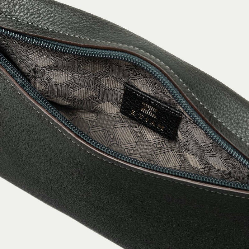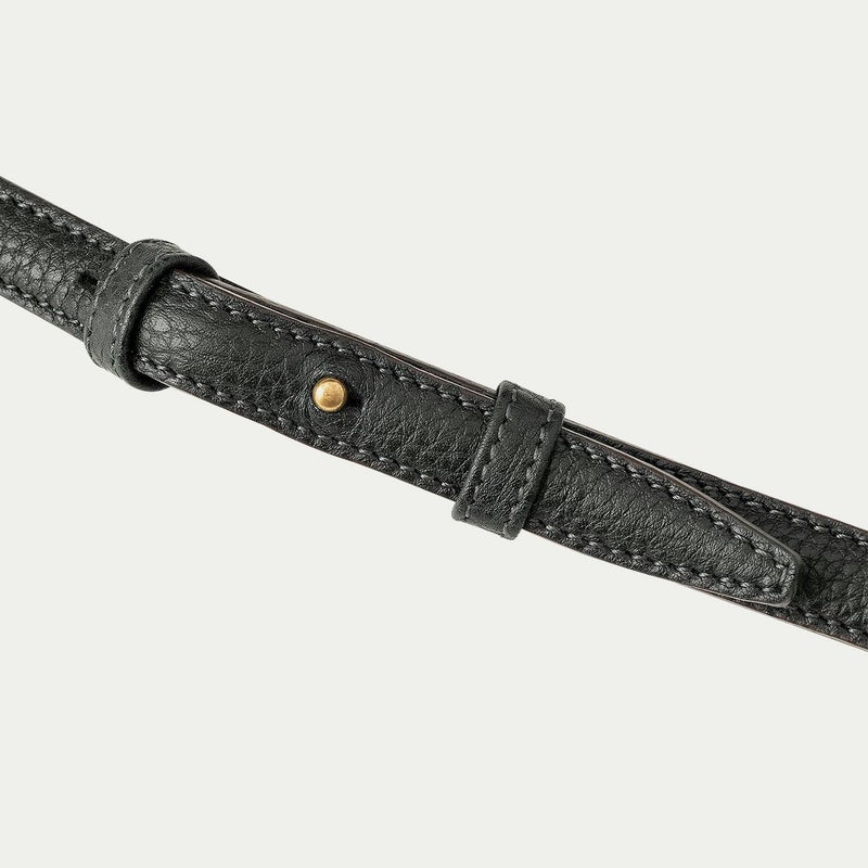前面に設けたファスナー式ポケットは、しっかりとスマートフォンを入れられる容量を確保するとともに、フラップのコバをシャープな焦げ茶色にすることで、丸みを帯びたボディのフォルムを際立たせる、シャープな直線の美しいバランスを実現。さらに、ショルダーベルトを細めにすることで、大げさ過ぎずにファッションに寄り添うながら、ボディとの接続にはカフスボタンを想わせる真鍮製のオリジナル金具を用いて、デザインのアクセントとしても魅力的に仕立てています。