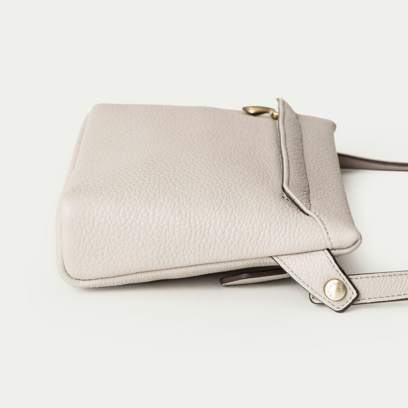 ソフトな心地よさで体にフィットして、調和するように密着しながら肩掛けできる、柔らかいクッションのような横型ショルダーパック。コンパクトながらも長財布を収納できるサイズ感で、ちょっとしたお出掛けに必要な貴重品を携えられます。また、内縫いの構造にするとともに、メインポケットの開口を上部ではなく背面にすることで、ふっくらとした印象のボディを強調。背面のファスナーにおいても、金属ではなくコイルファスナーを採用し、メイン素材である「シュリンクレザー」で覆うことで、カジュアル過ぎないルックスと洋服を摩擦で痛めない配慮を施しています。