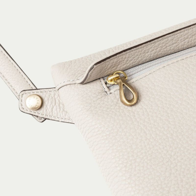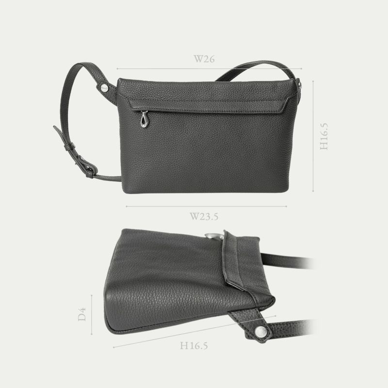 前面に設けたファスナー式ポケットは、しっかりとスマートフォンを入れられる容量を確保するとともに、フラップのコバをシャープな焦げ茶色にすることで、丸みを帯びたボディのフォルムを際立たせる、シャープな直線の美しいバランスを実現。さらに、ショルダーベルトを細めにすることで、大げさ過ぎずにファッションに寄り添うながら、ボディとの接続にはカフスボタンを想わせる真鍮製のオリジナル金具を用いて、デザインのアクセントとしても魅力的に仕立てています。