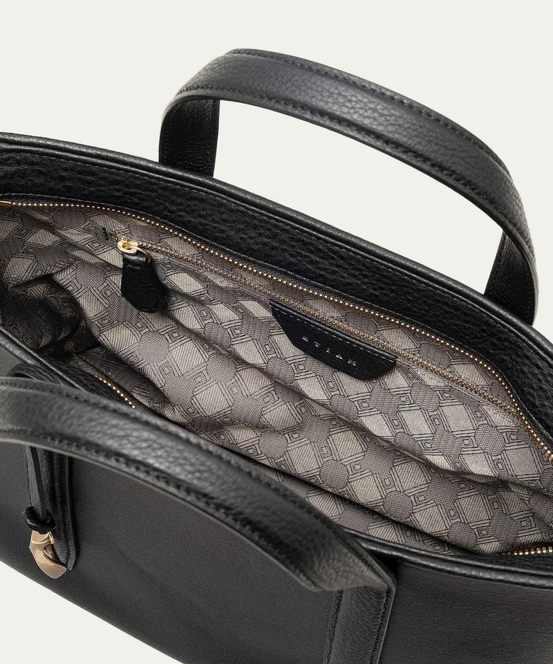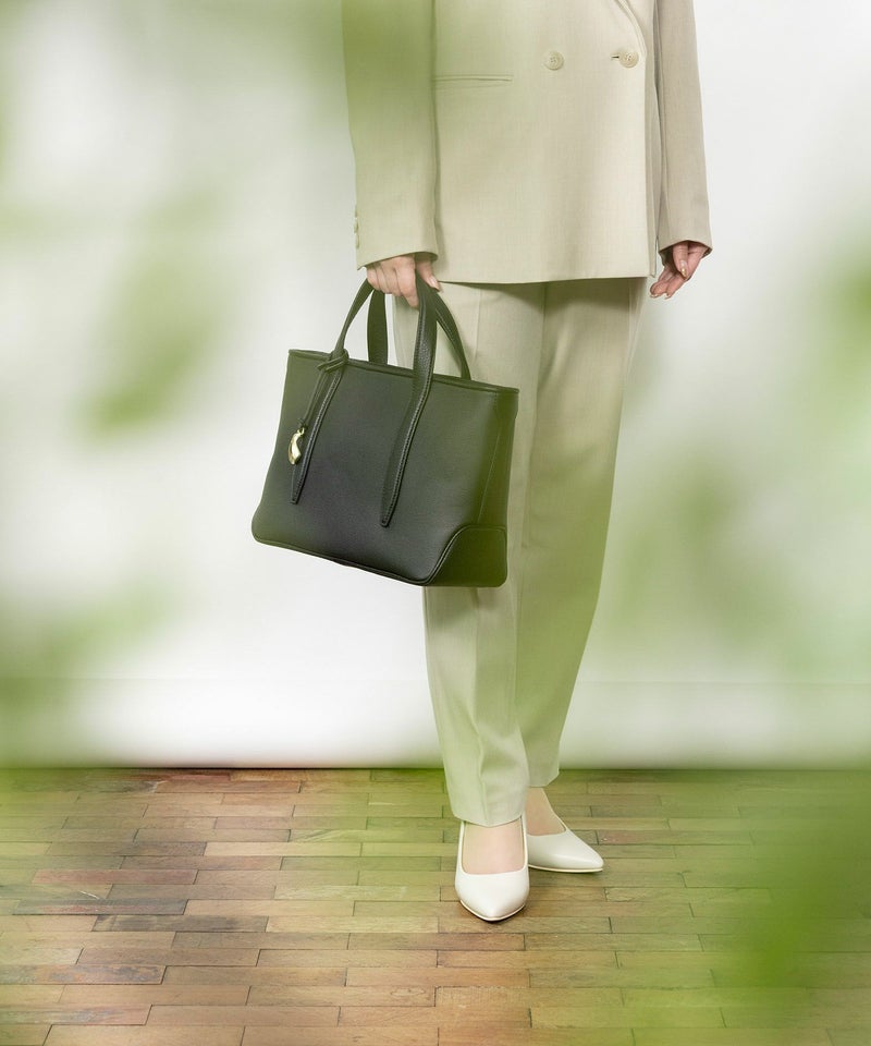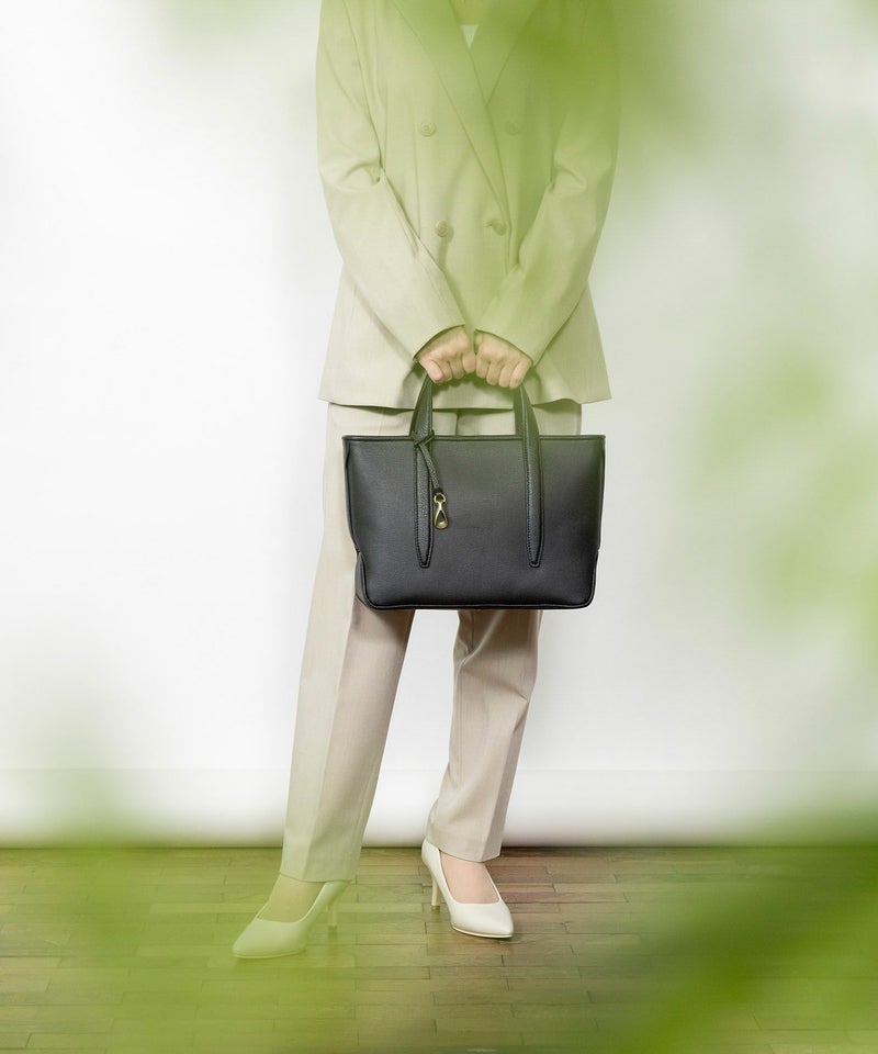 また、ハンドル・マチのセンター部・船底型の底面には「シュリンクレザー」を採用し、デザインのアクセントとしても貢献。また、同じレザーによるバッグ上部のパイピングは、細く丁寧な三つ折りにして断面を見せない細部へのこだわりもあり、内装の上部を同じレザーが覆うように設置しているので、ファスナーを開けたままでも上品に使いこなせます。
