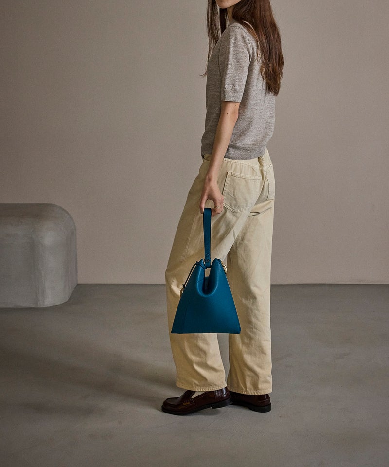 光を分散・屈折させて生まれる多彩な色を放つ光線のように、何気ない日常に鮮やかな色彩の輝きを添えてくれる、ユニセックスなデザインのトライアングルポーチ。ボディとストラップの接続用に開発したオリジナル金具により、たわみが美しい巾着のような上部のシルエットを創り出し、トライアングルを想わせる洗練されたフォルムへと導いています。