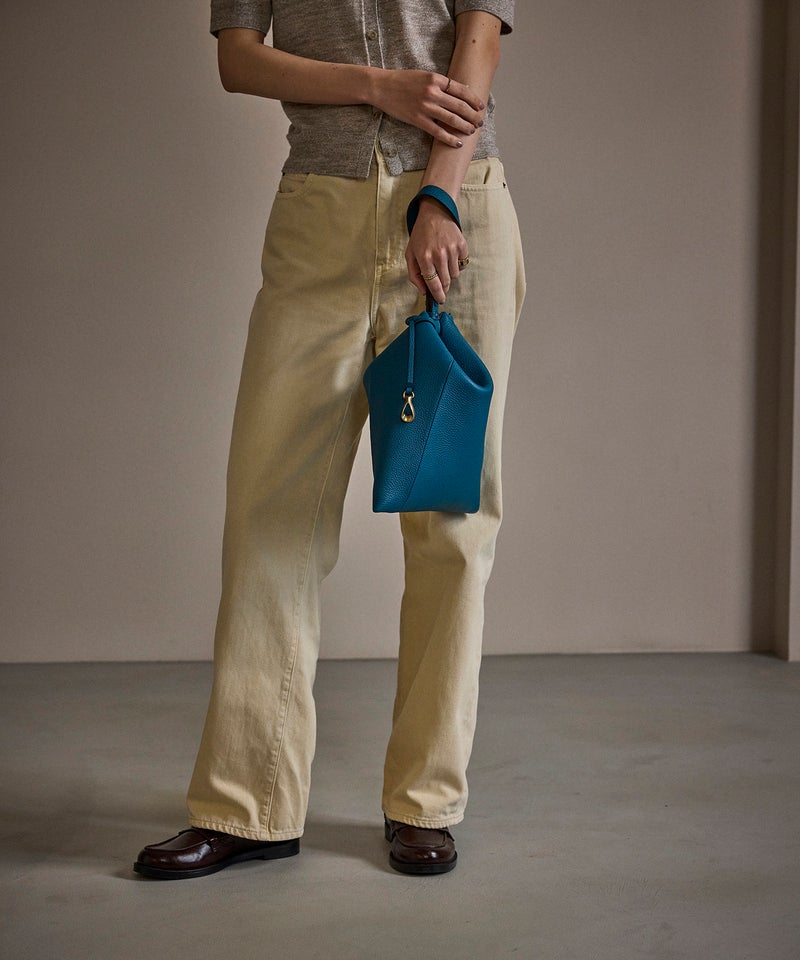 シボ感が美しい「シュリンクレザー」のボディに、柔らかくて程よいハリのある芯材を用いることで、型崩れしにくくキレイな形状のまま長く使いこなせるのも魅力。ハギ(繋ぎ目)は、前面センターに入れるのではなく、あえて両サイド斜めに設けることで、上部の三角形を生かした菱形のエレガントな印象へ。同じ素材のレザーストラップは、接続金具を軸にフレキシブルに回転し、軽やかに手首に通して持ち歩くことができます。