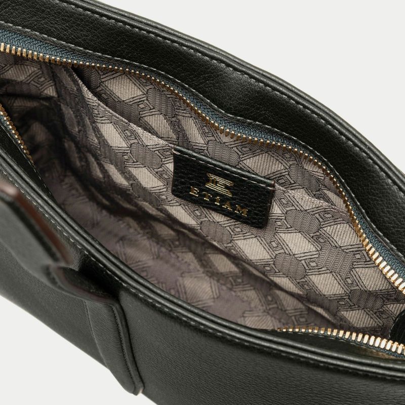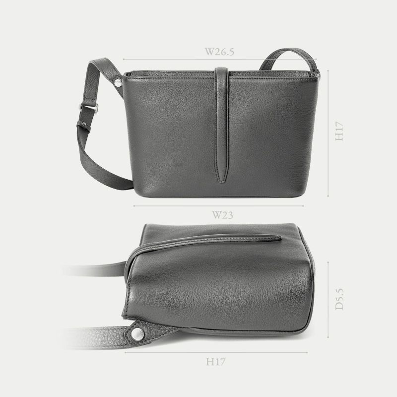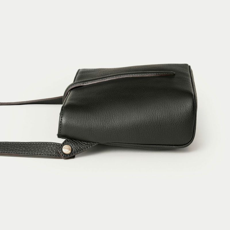 気持ちと姿勢を正してくれるようなイメージを抱く、前面センターにあしらわれた肉厚ベルトと、天ファスナーによる二重の開閉にすることで、大事に収納物を持ち歩ける横型ミニショルダー。安心感を与えながらも、ベルトが背面のマグネット式で留まっており、持ち物の出し入れを素早く行えます。また、同じマグネットで開閉できる背面ポケットも設け、スマートフォンなどの収納に活躍するとともに、背面と底面を一枚仕立て構造にすることで、ハギがなく体あたりも快適な柔らかさを実現。ファスナーの両端は、型紙の形状を半円にして隙間を抑えていて、貴重品なども安心して収納しておけます。