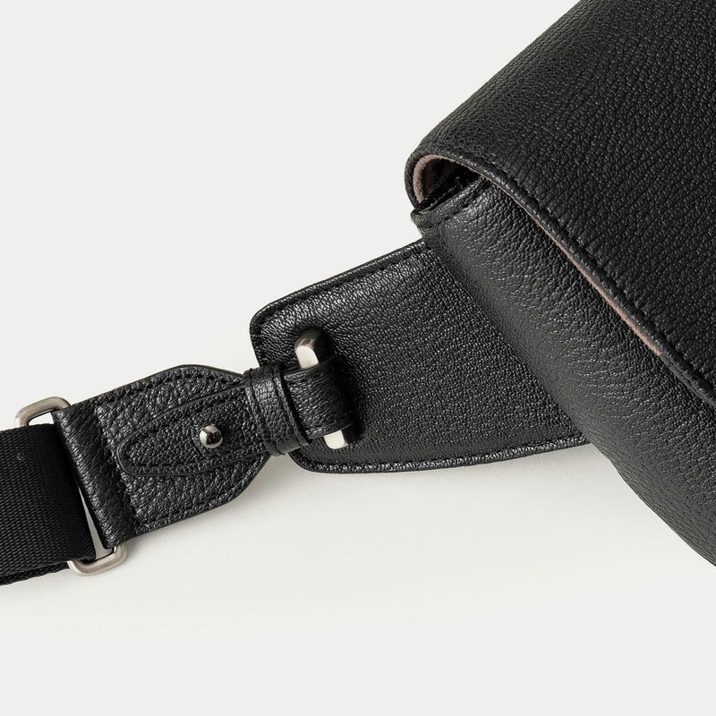 気軽に身につけたり自由に動けたり、解放的な気分で連れて行ける、大人カジュアルなボディバッグ。シンプルさを追求したデザインで、カジュアルダウンしたコーディネートに合わせやすく、コートやジャケットなどのエレガントな装いにも似合います。海外の有名メゾンでも愛用されている、フランス・ジュリアン社製のゴードレザー「シェーブル」を纏わせたボディは、前面とマチの間・背面と底面の間の繋ぎ目をなくすことで、装着時に体あたりが柔らかくなる機能性も実現。高級感あふれる立体的なシボに、ETiAM特注のセミマットな表情で上質感を演出するとともに、キズが目立ちにくく経年変化も余りないので、キレイな状態のまま長く使い続けられるのも魅力です。