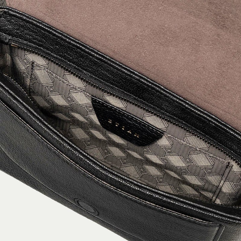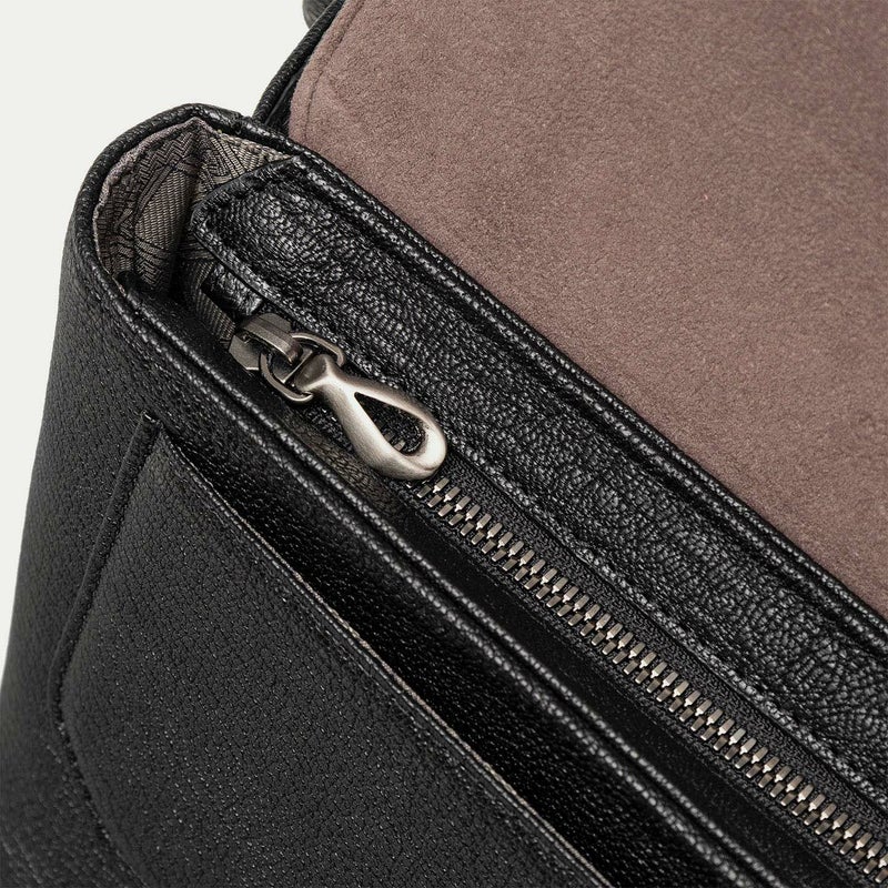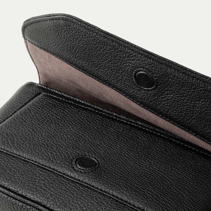 クラシックな印象のフラップは、マグネット式で簡単に開け閉めでき、天ファスナーも設けることで荷物の落下を防止する配慮も。また、装着時の重要なファクターになるショルダーベルトは、シルクのように上品で落ち着いた中空糸ナイロンテープを採用し、軽量な実用性と見た目の美しさにこだわっています。それらのチャームにもなっているYKK最高峰エクセラWファスナーの引き手や、ショルダーベルトの接続部・長さ調整部には、真鍮金具を使用。ブラックニッケルにシルバーヘアラインを施した特別仕様で、スタイリッシュさをさらに高めています。