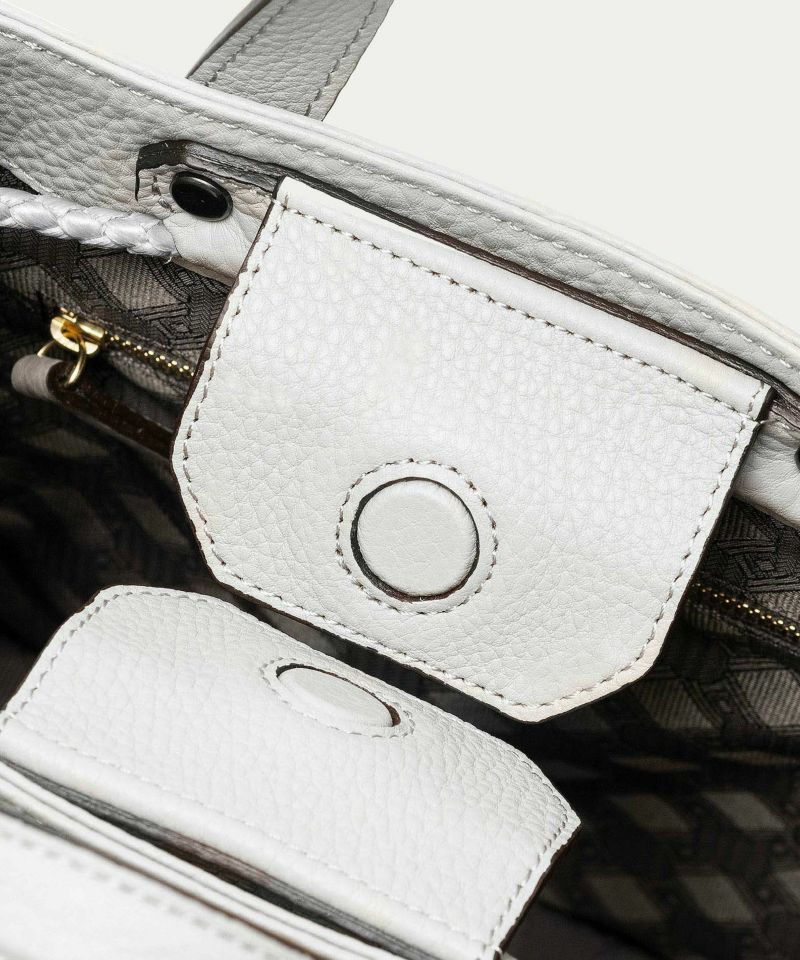 マグネット式の開口部に、広めのレザーパーツを設けて隙間を狭めることで、中身の収納物をさりげなく隠す役割も。背面ポケットは、あえて開閉具を備えさせず、スマートフォン・パスケース・駐車券などを、さっと取り出せる快適さを実現。さらに、弾力性のある柔らかなボディに対して、底面をレザーフレーム構造で硬めに仕上げることで、美しい形状を保っています。