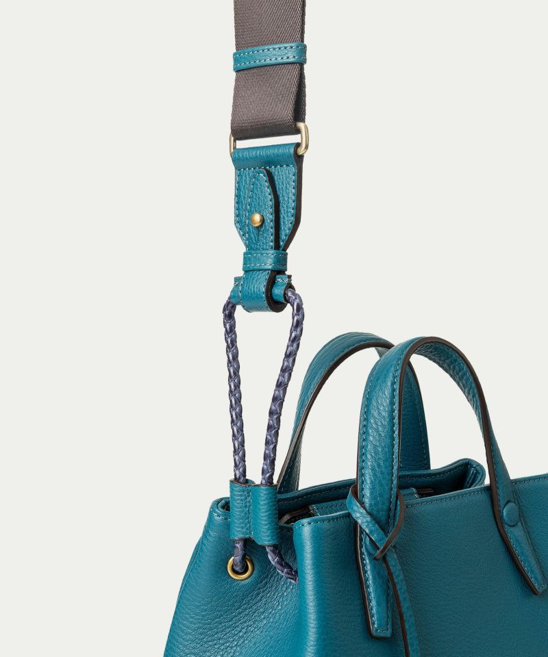 巾着型のドローストリング仕様で、絞られたマチに動きのある紐が遊び心を添えながら、前面・背面は内装に通すことで、落ち着きのある大人感を演出。強度に優れたポリエステル製で、レザーを編み込んだような上質感があり、先端のレザー部にショルダーベルトを接続できる仕様になっています。ドローストリングとの軽やかな接続が、アクティブで軽快な雰囲気を醸成。中空糸を高密度に織っているナイロンテープは、軽量でしっかりとした厚みを確保しつつ、シルクのような光沢感があるので、カジュアルになりがちな斜め掛けも上品に装えます。