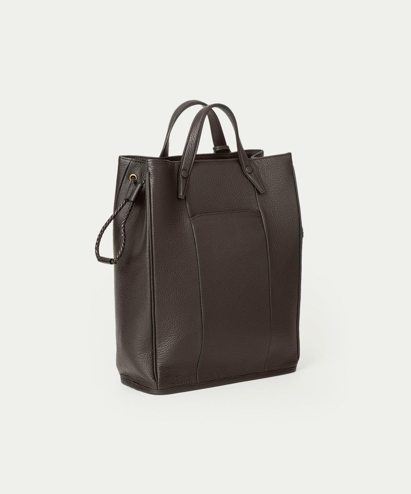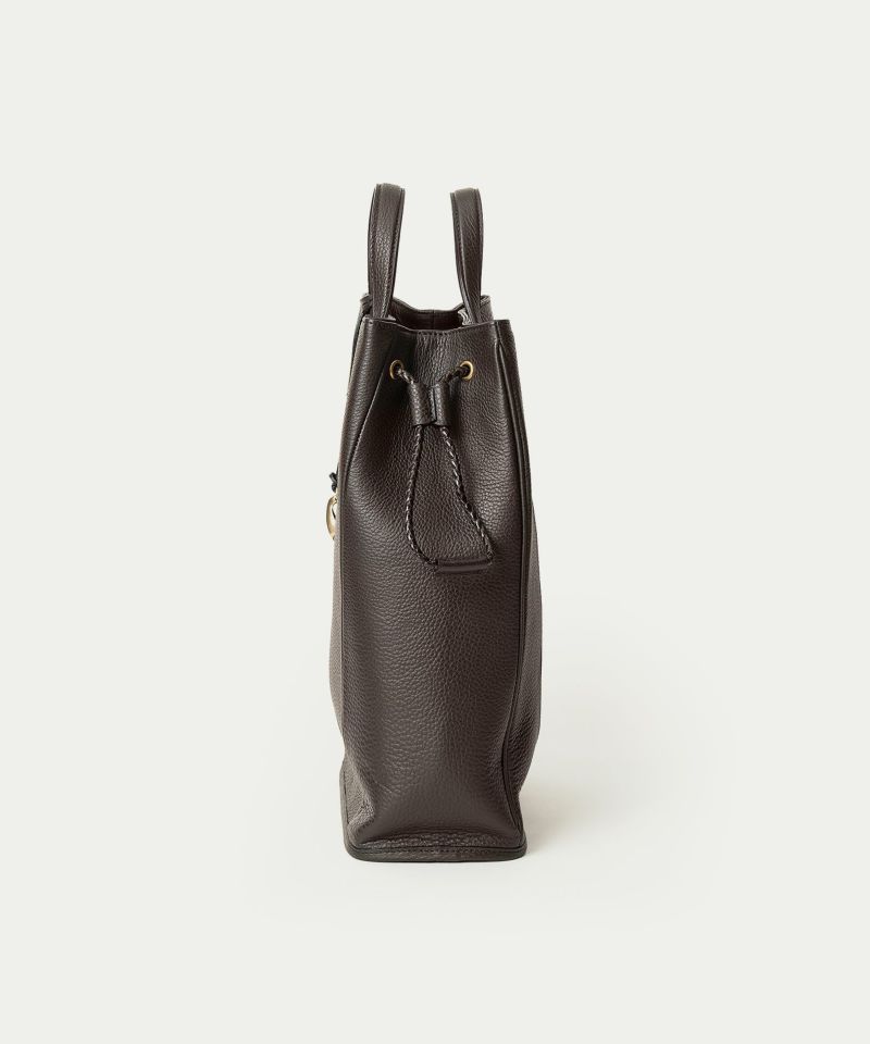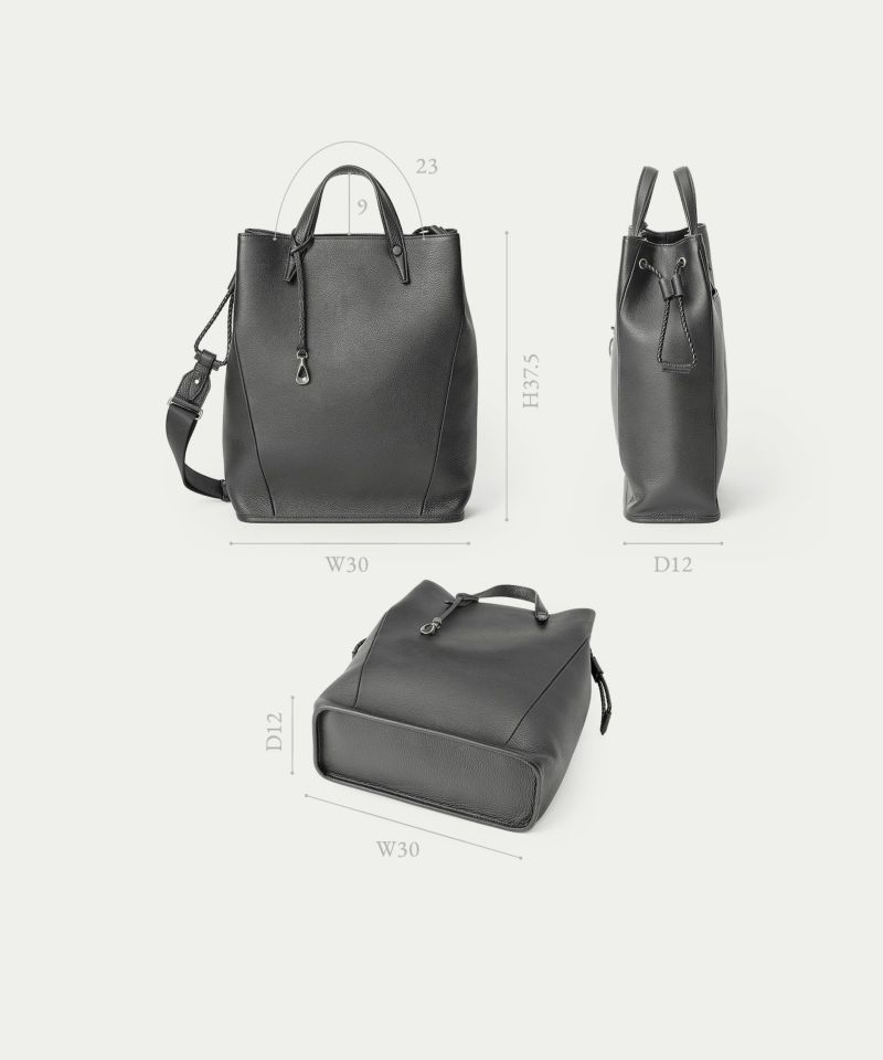 フォルムの変化に柔軟な曲がり方で自然に対応しながら、しっかりとA4サイズを収納できる、ドローストリングショルダーバッグL。シボ感が美しい「シュリンクレザー」のボディに、優雅な曲線のハギ(繋ぎ目)を、マチ上部から前面下部にかけて左右シンメトリーで設けることで、縦のラインを強調しています。また、肉厚で丈夫なハンドルとの接続を、縫製ではなくリベット式にして、よりスッキリとした軽快な印象へ。ハンドルの立ち上げを少し高く設け、手持ちだけなく手首に通して持つこともでき、取り外し可能なショルダーベルトとの2WAYで、気分や用途に合わせたスタイルで持ち歩くことができます。