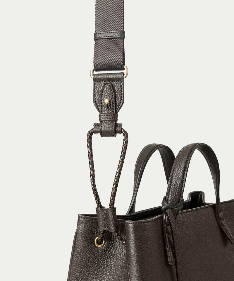 巾着型のドローストリング仕様で、紐の動きが美しく絞られたマチに遊び心を添えながら、前面・背面は内装に通すことで、洗練されたスタイリュシュな佇まいへ。レザーを編み込んだような上質なポリエステル製で、強度にも優れており、先端のレザー部にショルダーベルトを接続できる設計になっています。しなやかで柔軟な接続部が、軽やかでアクティブな雰囲気を演出。シルクのような光沢感が美しいナイロンテープは、カジュアルになりがちな斜め掛けも上品に引き立ててくれます。