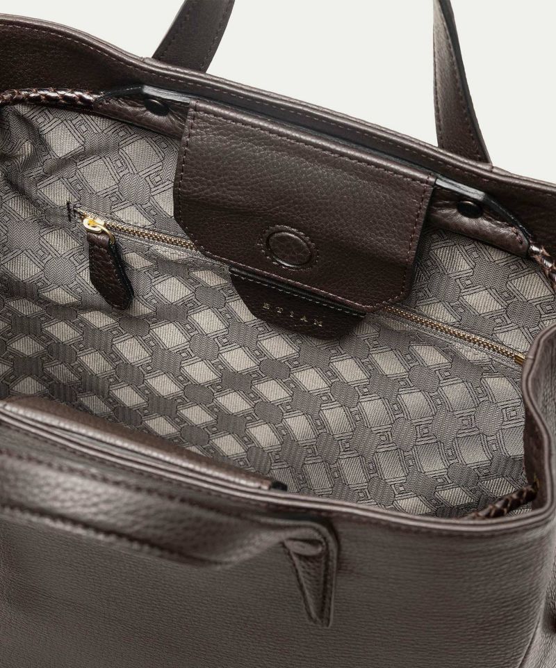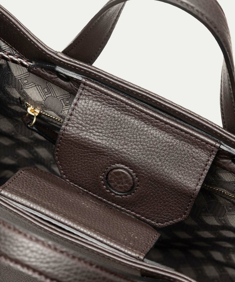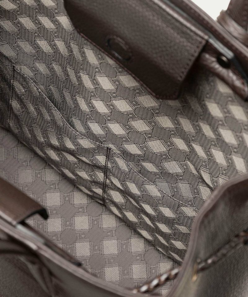 広めのレザーパーツを備えたマグネット式の開口部は、隙間を狭めて中身の収納物をさりげなく隠す役割も。あえて開閉具を設けていない背面ポケットは、スマートフォン・パスケース・駐車券などを、さっと取り出せる快適さを追求。さらに、弾力性のある柔らかなボディに対して、底面をレザーフレーム構造で硬めに仕上げて、美しいシルエットをキープしています。