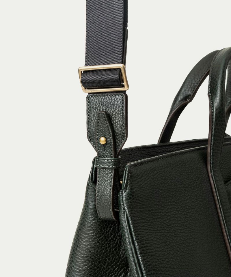 肩掛け・斜め掛けなど多彩なスタイルに対応できるショルダーベルトも付属し、マチの上部に設けた接続金具には、ブラックニッケルメッキを施したオリジナル真鍮金具を採用。ショルダーベルトを外しているときでも目立つことなく、洗練されたスタイリッシュさを添えてくれます。