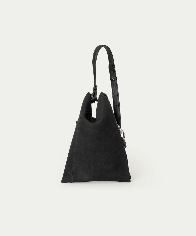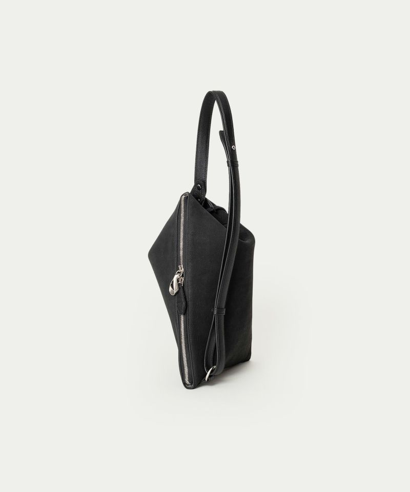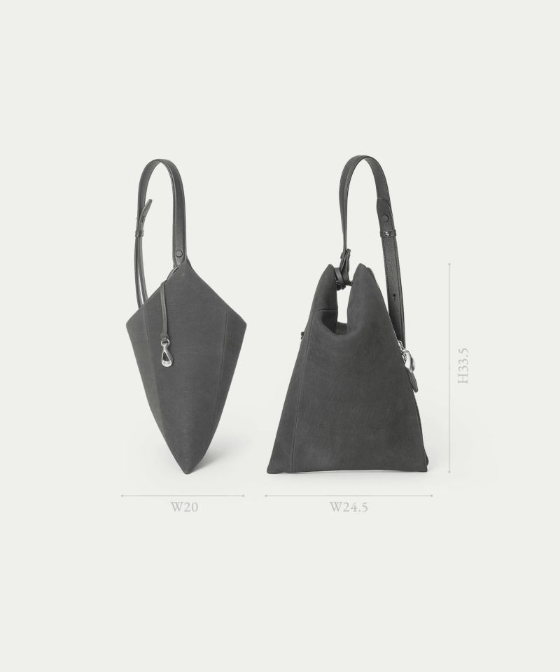まるで幾何学模様の頂点をイメージさせるようなシャープなフォルムが、何気ない日常の装いに印象的な存在感を添えてくれる、トライアングルショルダーバッグ。ボディとショルダーベルトの接続用に開発したオリジナル金具が、たわみが美しい巾着のような独特のシルエットを生み、トライアングルを想わせる端正なラインを描き出しています。