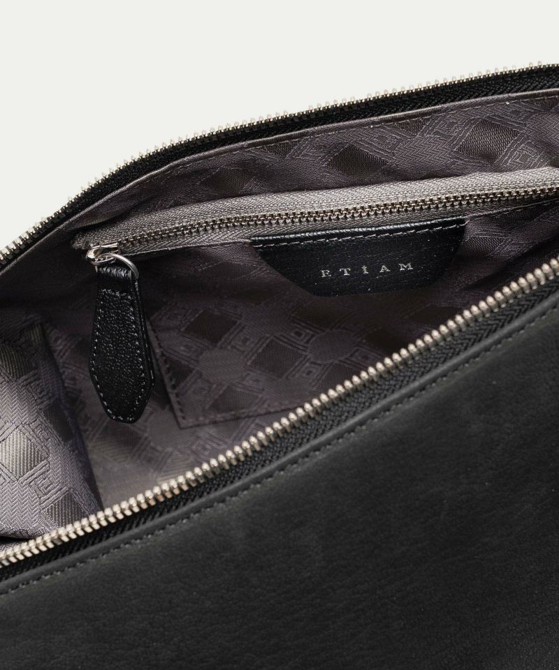 背面の開閉には、YKK最高峰のエクセラWファスナーを使用し、スマートフォン・ミニ財布・ペットボトルなどをしっかりと収納。また、内装にはファスナーポケットを装備し、鍵・パスケース・小物などを整理して持ち運べます。さらに、下部を内側に折り畳むことでコンパクトにでき、かさばらずにバッグやスーツケースへの収納も。普段使いはもちろん、旅先や出張先などでも性別を問わずスタイリッシュに使いこなせます。