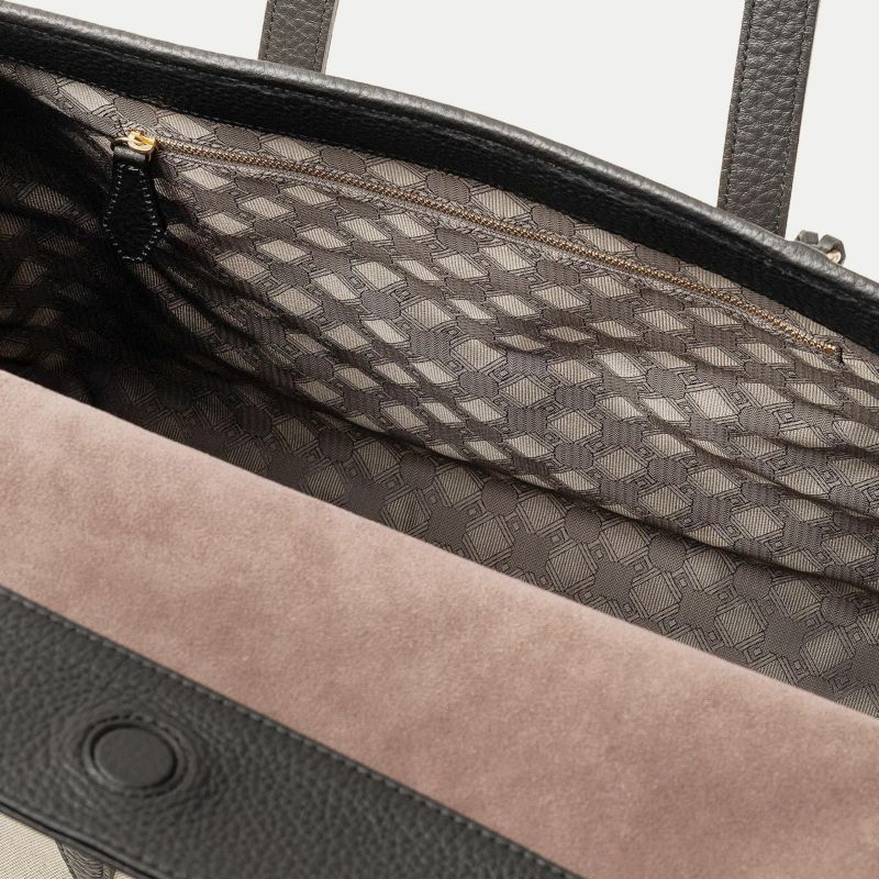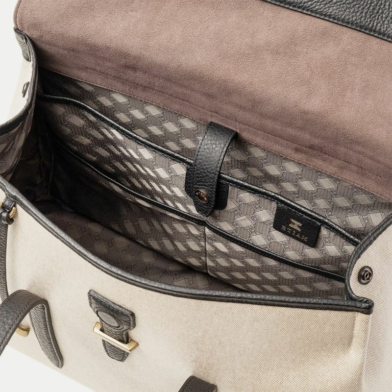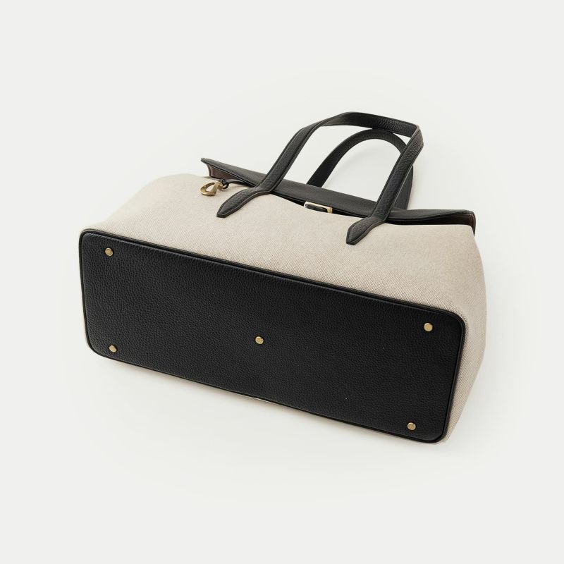 旅行・出張・ゴルフなどで少し荷物が多いときにも、上品にコーディネートして持ち歩ける、15インチのノートPCやB4の書類を収納できて肩掛けハンドル仕様のフラップトートバッグ。フロントとマチが一体になった、「キャンバス生地」一枚仕立てにすることで、ふっくらとした美しいシルエットを叶えるとともに、サイドに設けられたスナップボタンでマチ幅を調整できたり、フラップをイミテーションの差し込み金具にしてマグネットで簡単に開け閉めできたりするなど、エレガントなデザイン性とカジュアルな機能性を併せ持っています。
