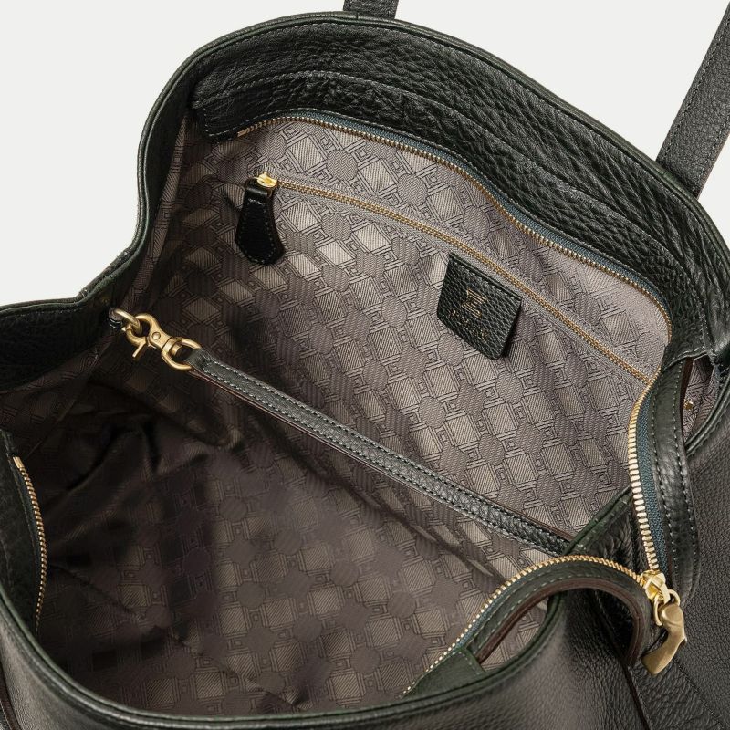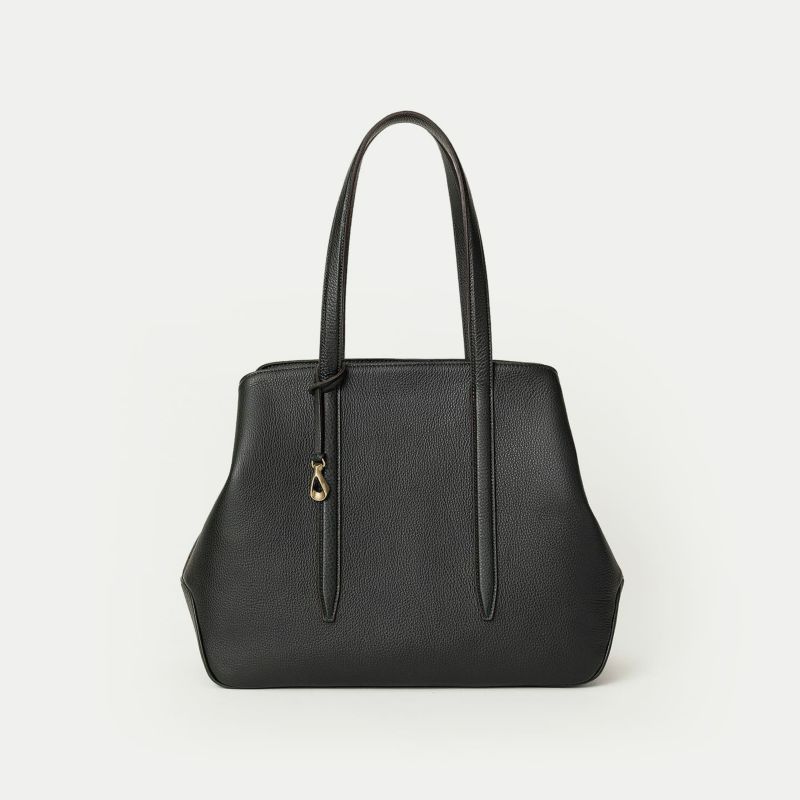 また、バッグの上部を、左右のマチに向かって下がっていくラインにしているのは、マチを内側に折り畳んでも天ファスナーがぶつからないための機能性とともに、エレガントで個性的な見た目の美しさも両立。さらに、底マチは、くびれをセンターに施すことで、肩掛けするときに体にフィットしてスムーズに持ち歩ける実用性と、独特のライン&フォルムがアクセントになっているデザイン性も兼ね備え、フォーマルにもカジュアルにもフレキシブルに活躍してくれます。