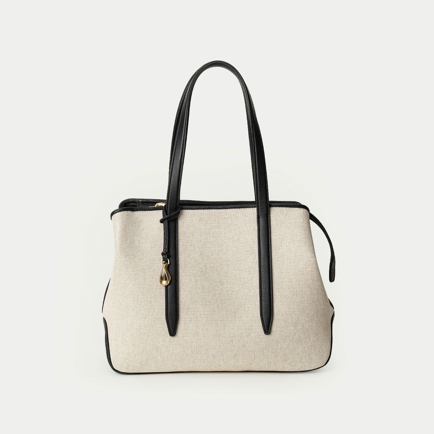 ソフトで馴染みやすい仕上がりで、プライベートにもビジネスにも柔軟に使える、A4サイズを収納可能なファスナー開閉式の「キャンバス生地」をメインにしたトートバッグ。会社への出勤やカフェでのリモートワークには、ノートパソコンなどを収納・携帯するために大容量が必要ですが、休日などで収納・携帯する物が少ないときには、マチを内側に折り畳んでコンパクトにすることができ、2通りのシルエットを用途に合わせて自由に楽しめるのも魅力です。