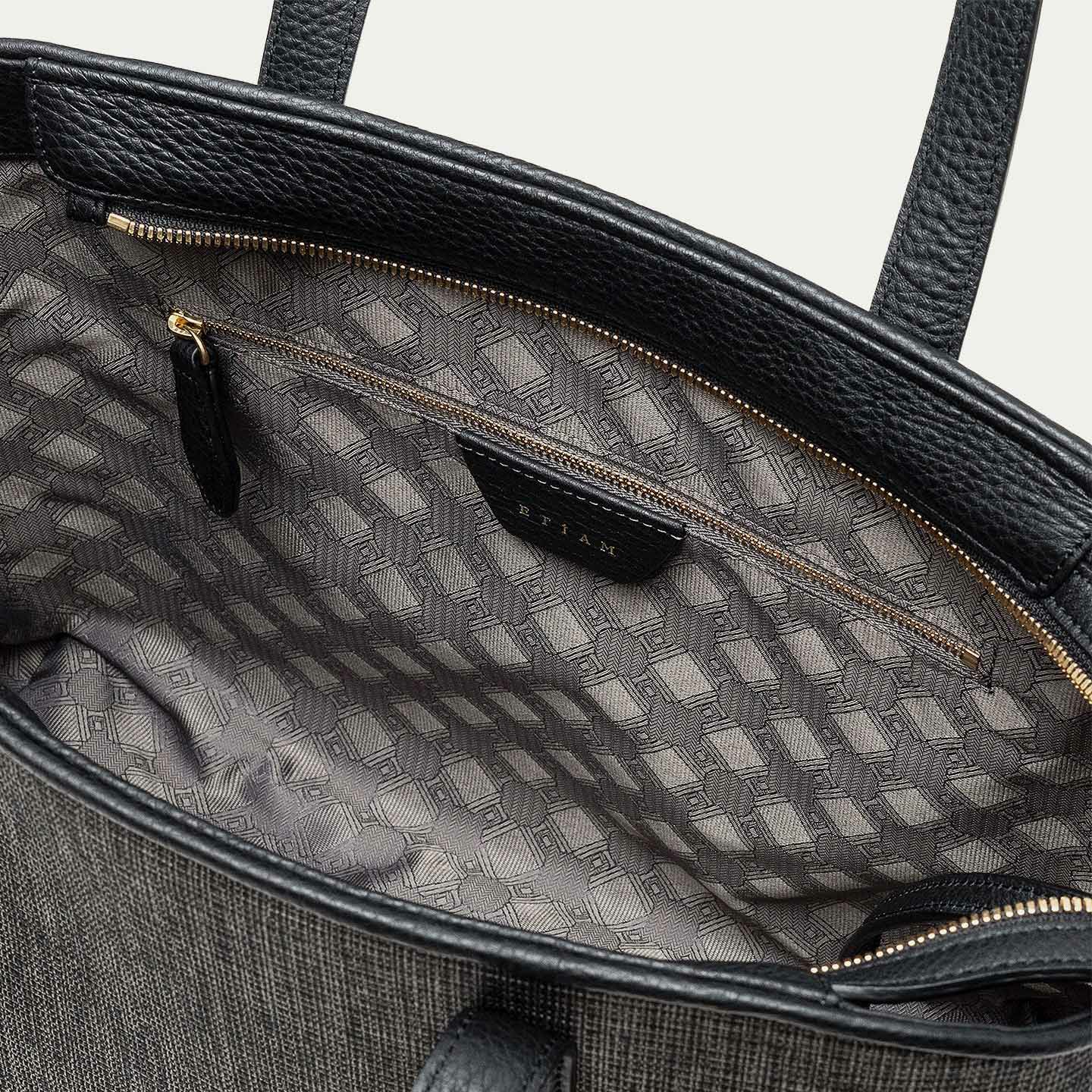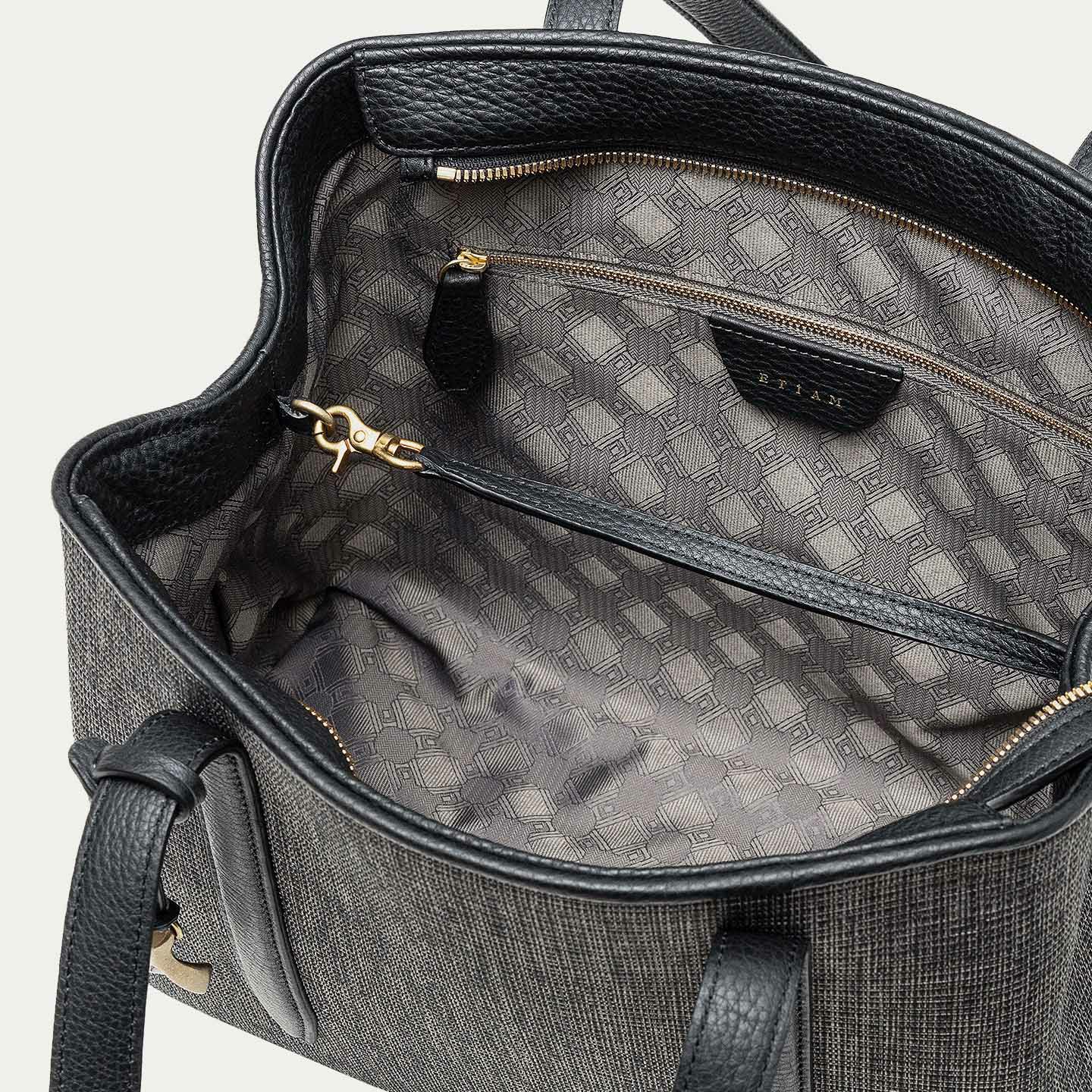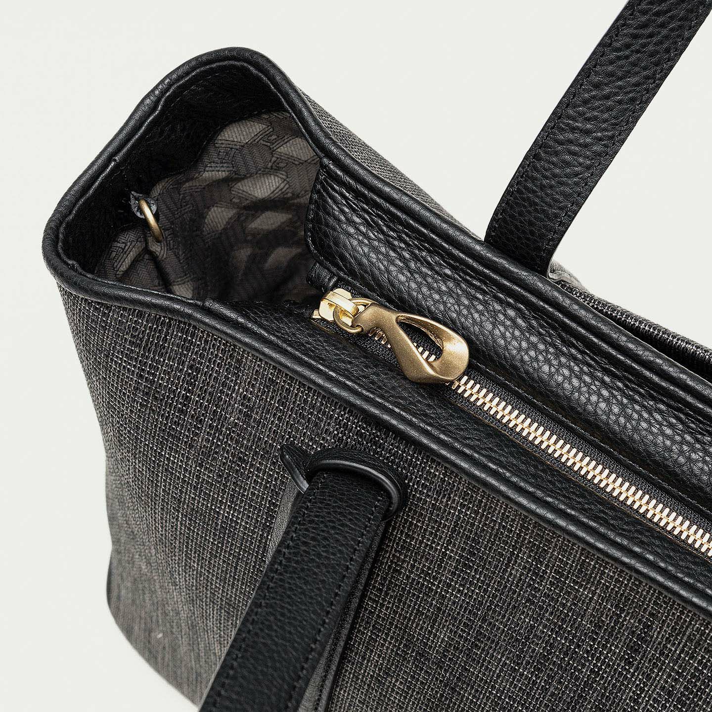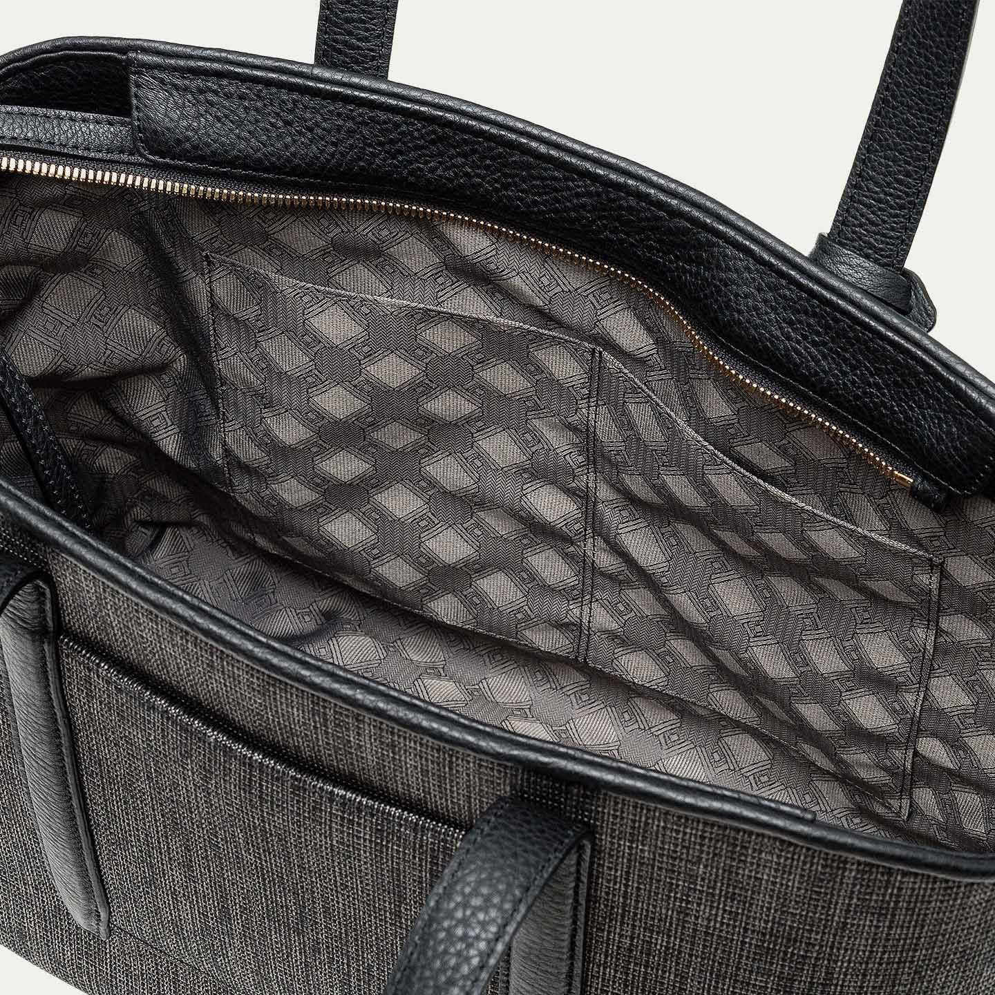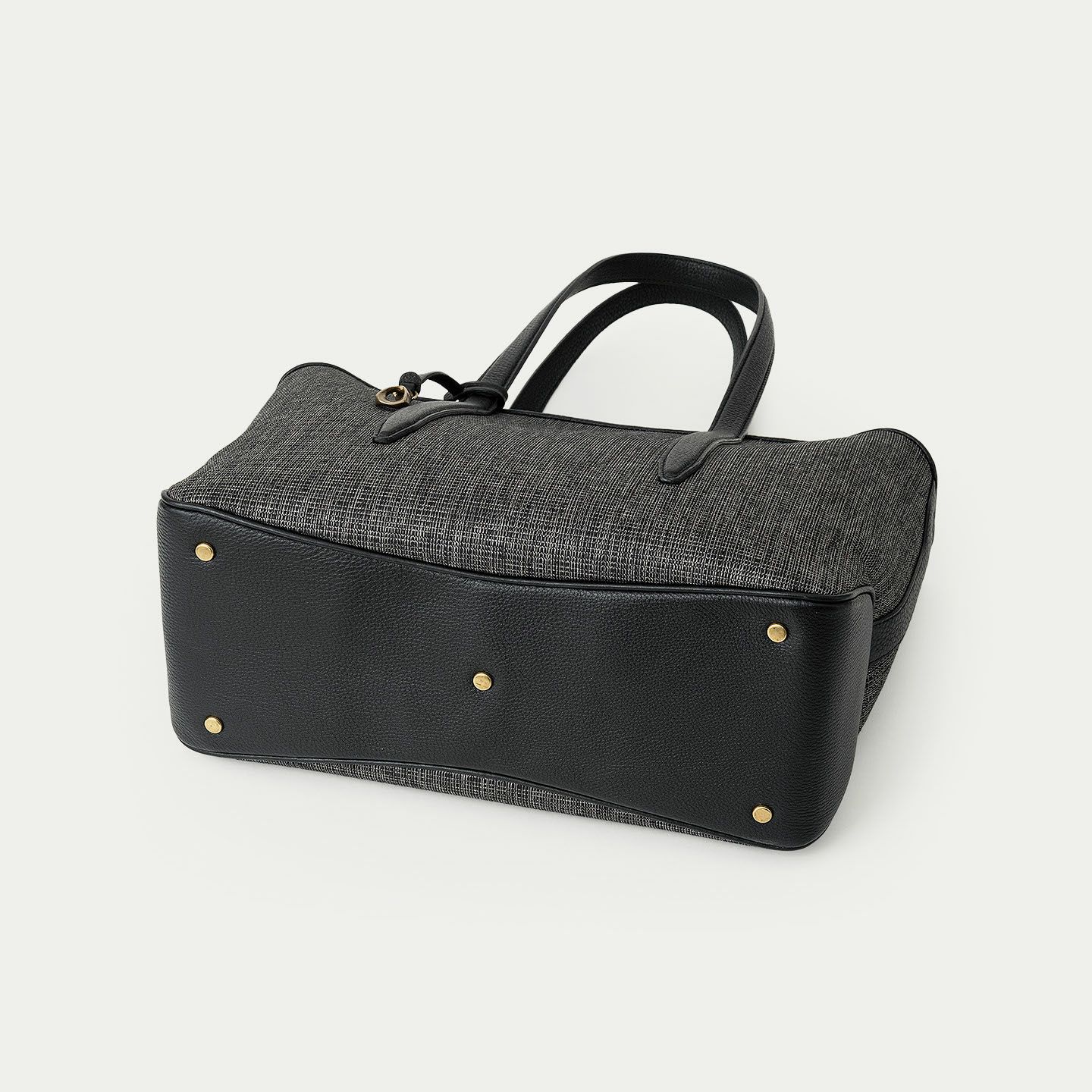 奥行きのあるグラデーションが個性的で、コーディネートの幅を広げる異業種の素材「インテリアファブリック」をメインにした、プライベートにもビジネスにも柔軟に使える、A4サイズを収納可能なファスナー開閉式のトートバッグ。会社への出勤やカフェでのリモートワークには、ノートパソコンなどを収納・携帯するために大容量が必要ですが、休日などで収納・携帯する物が少ないときには、マチを内側に折り畳んでコンパクトにすることができ、2通りのシルエットを用途に合わせて自由に楽しめるのも魅力です。