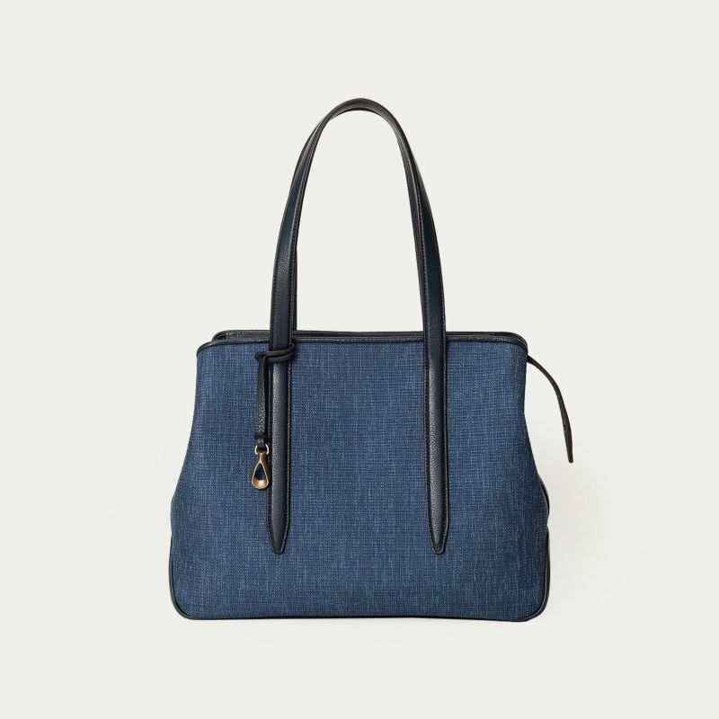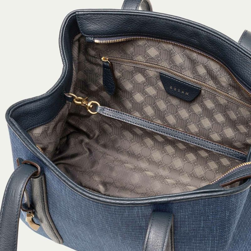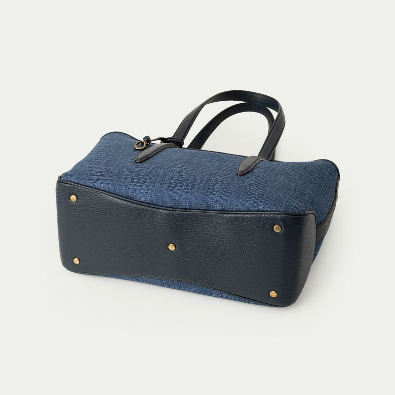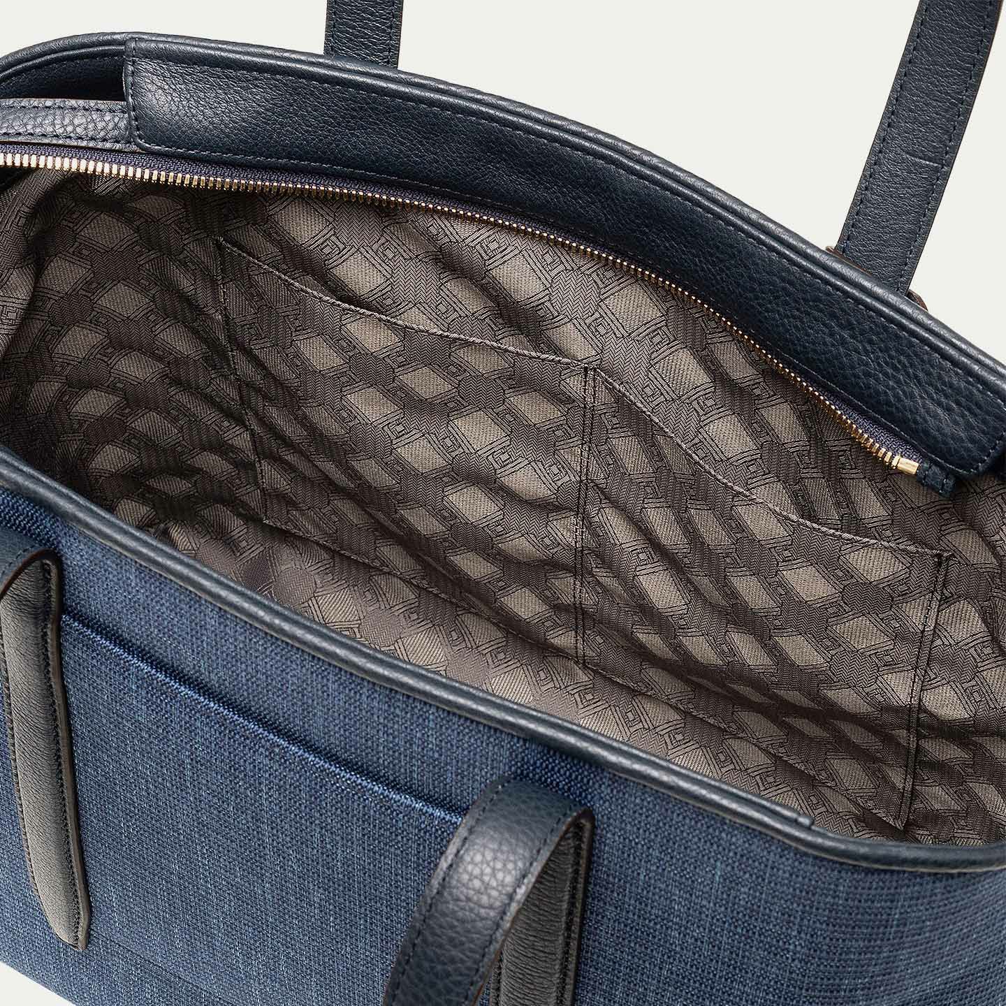奥行きのあるグラデーションが個性的で、コーディネートの幅を広げる異業種の素材「インテリアファブリック」をメインにした、プライベートにもビジネスにも柔軟に使える、A4サイズを収納可能なファスナー開閉式のトートバッグ。会社への出勤やカフェでのリモートワークには、ノートパソコンなどを収納・携帯するために大容量が必要ですが、休日などで収納・携帯する物が少ないときには、マチを内側に折り畳んでコンパクトにすることができ、2通りのシルエットを用途に合わせて自由に楽しめるのも魅力です。
