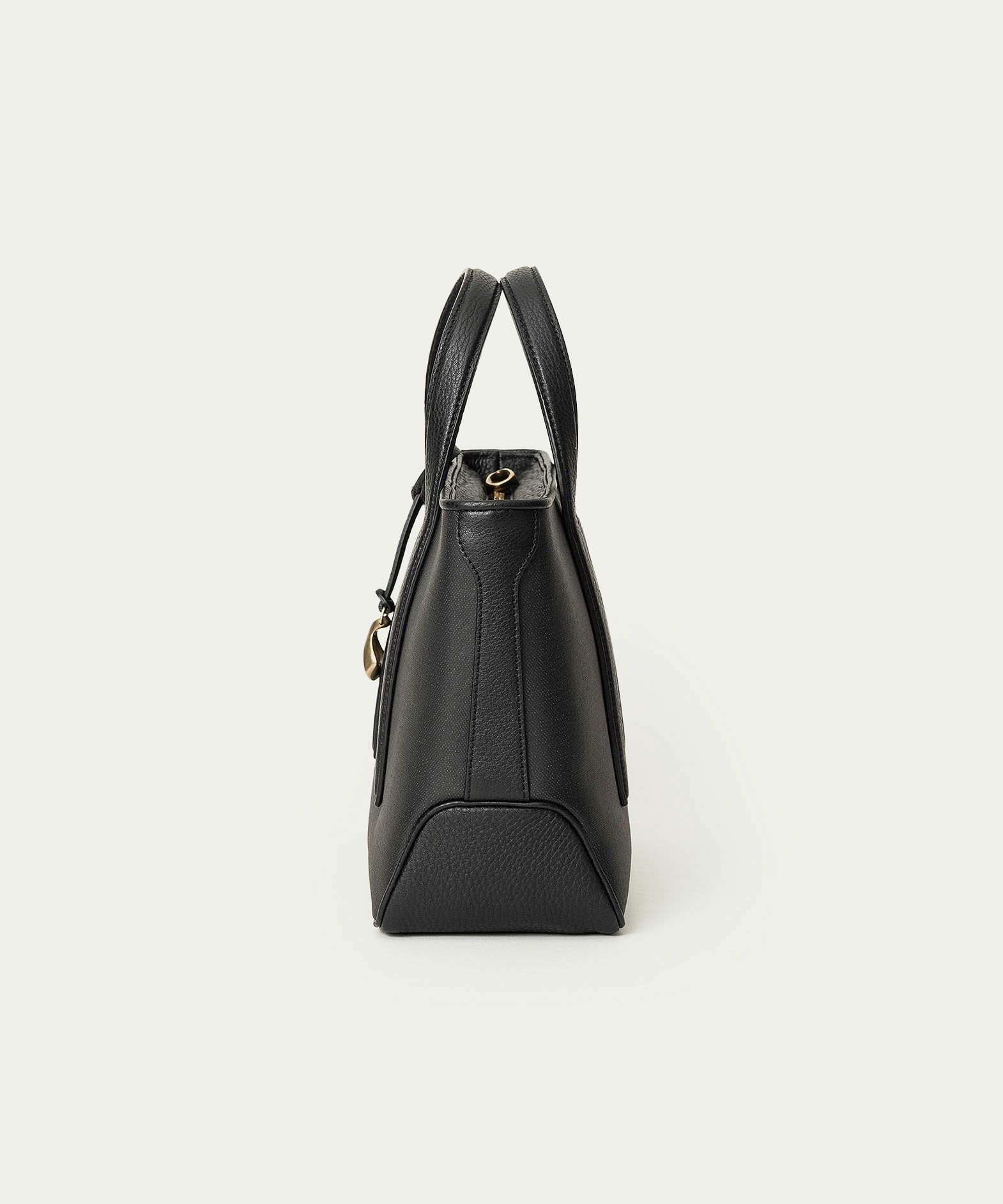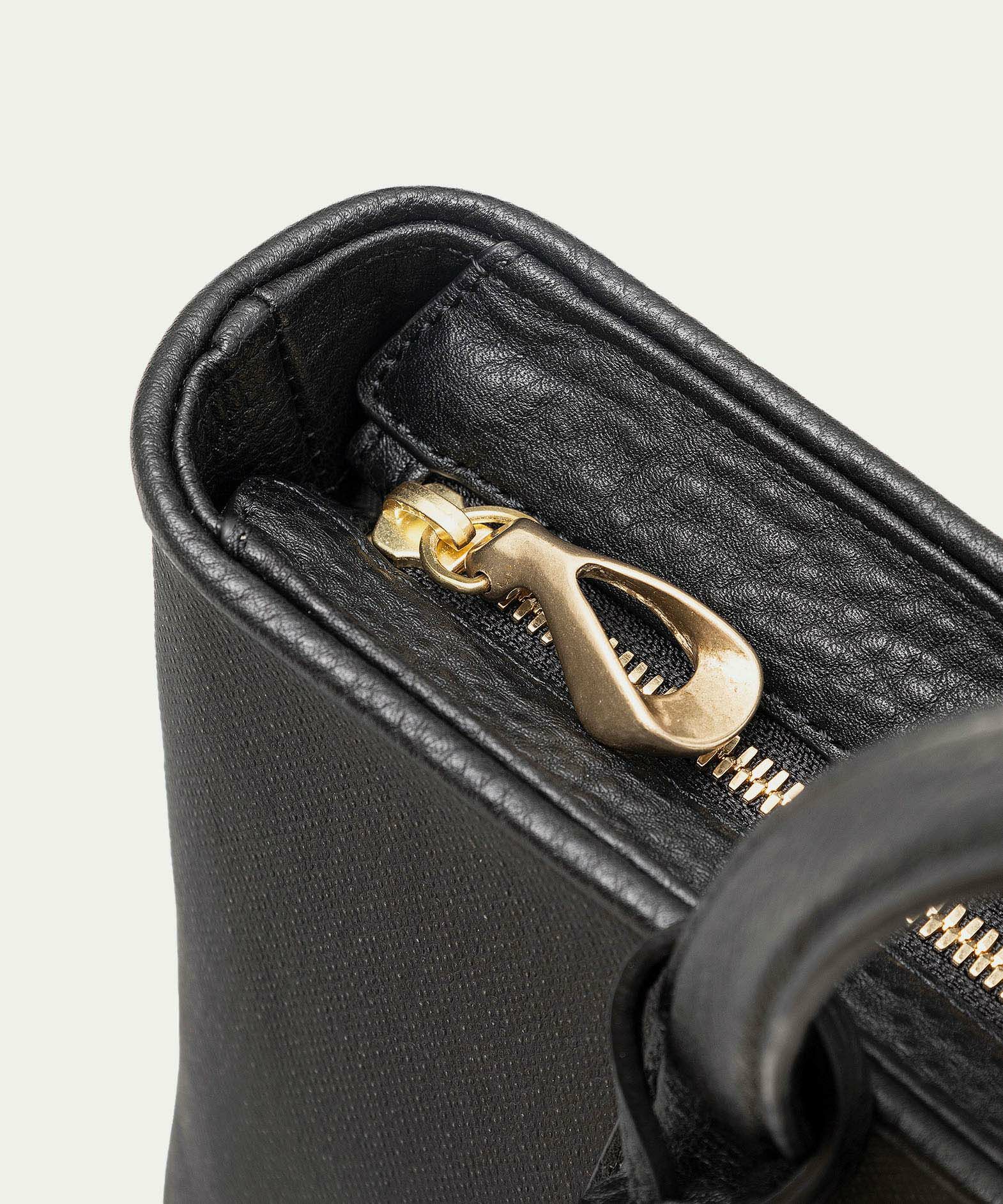 また、ハンドル・マチのセンター部・船底型の底面には「シュリンクレザー」を採用し、デザインのアクセントとしても貢献。また、同じレザーによるバッグ上部のパイピングは、細く丁寧な三つ折りにして断面を見せない細部へのこだわりもあり、内装の上部を同じレザーが覆うように設置しているので、ファスナーを開けたままでも上品に使いこなせます。
