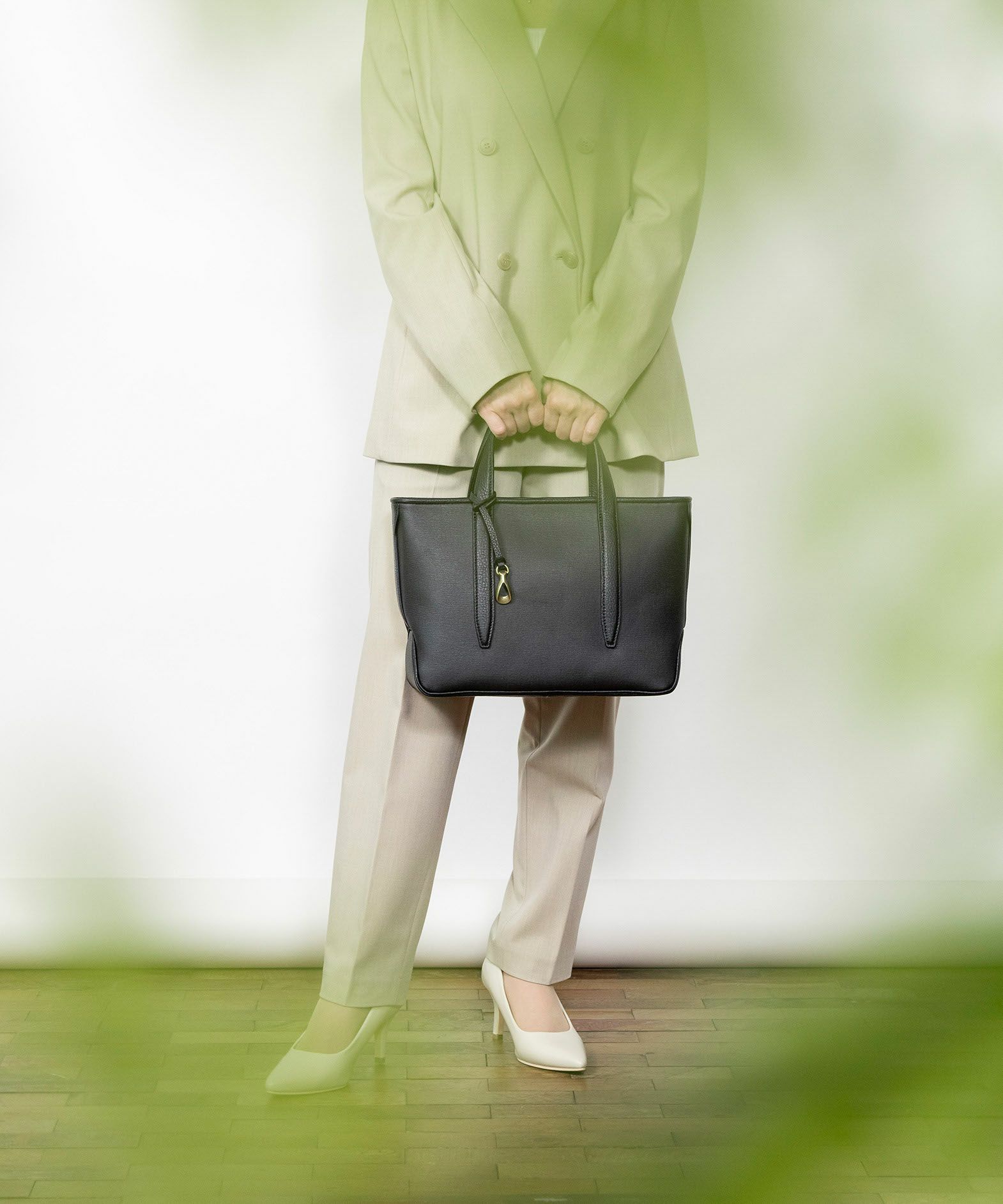 メイン素材の「キャンバス生地」表面に、墨黒のポリウレタン加工を施すことで、高級感あふれるレザーや織物のような質感へ。独特の風合いを醸し出すとともに、一年を通してコーディネートしやすく、生地目を残しながら汚れが目立ちにくいのも特長。その裏面にはスポンジ加工を施し、シワにならない弾力感のある柔らかさと、張りのある美しいシルエットも実現しています。