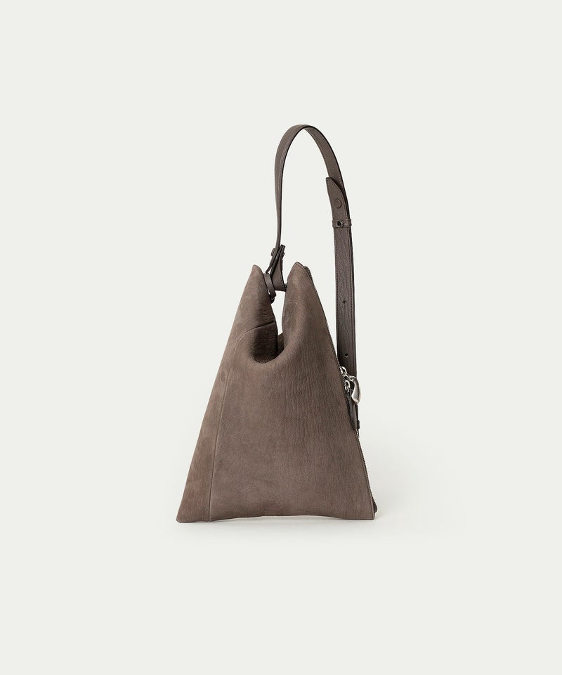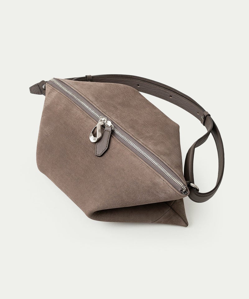 まるで幾何学模様の頂点をイメージさせるようなシャープなフォルムが、何気ない日常の装いに印象的な存在感を添えてくれる、トライアングルショルダーバッグ。ボディとショルダーベルトの接続用に開発したオリジナル金具が、たわみが美しい巾着のような独特のシルエットを生み、トライアングルを想わせる端正なラインを描き出しています。