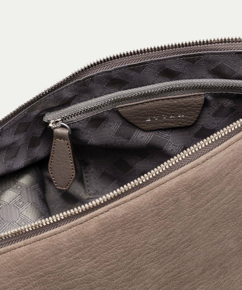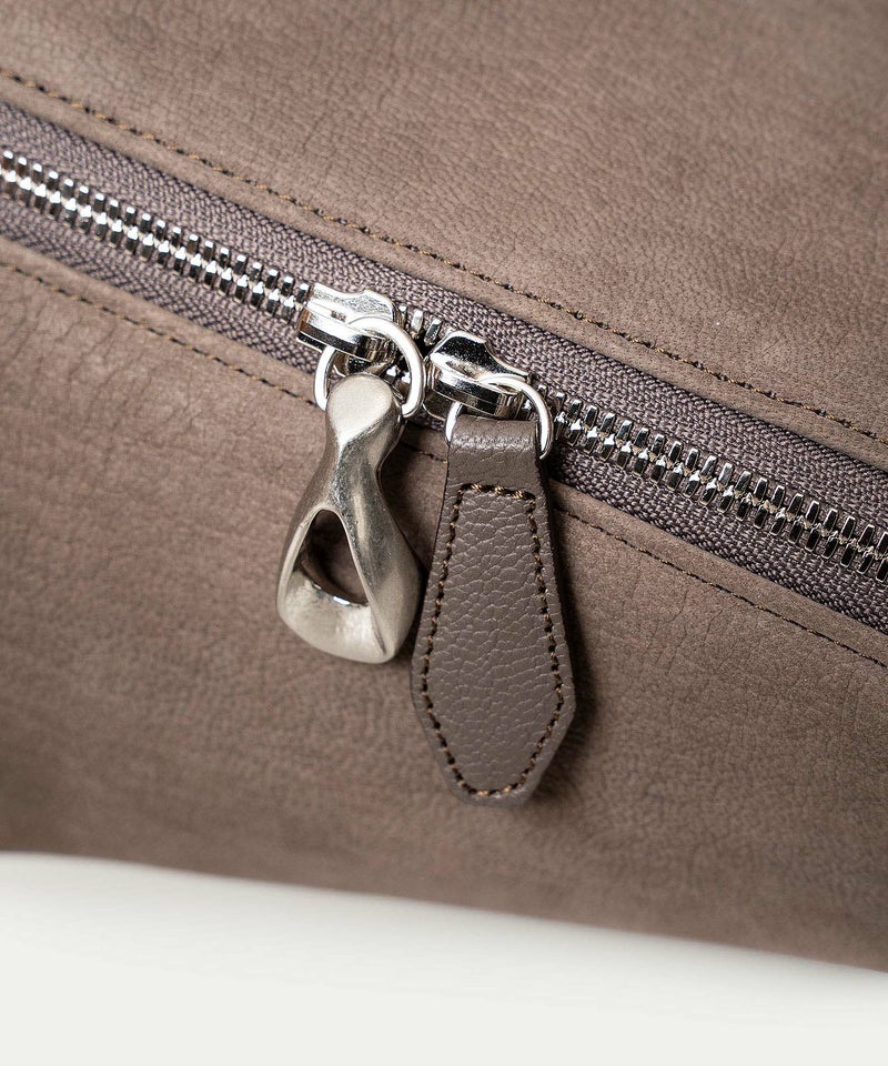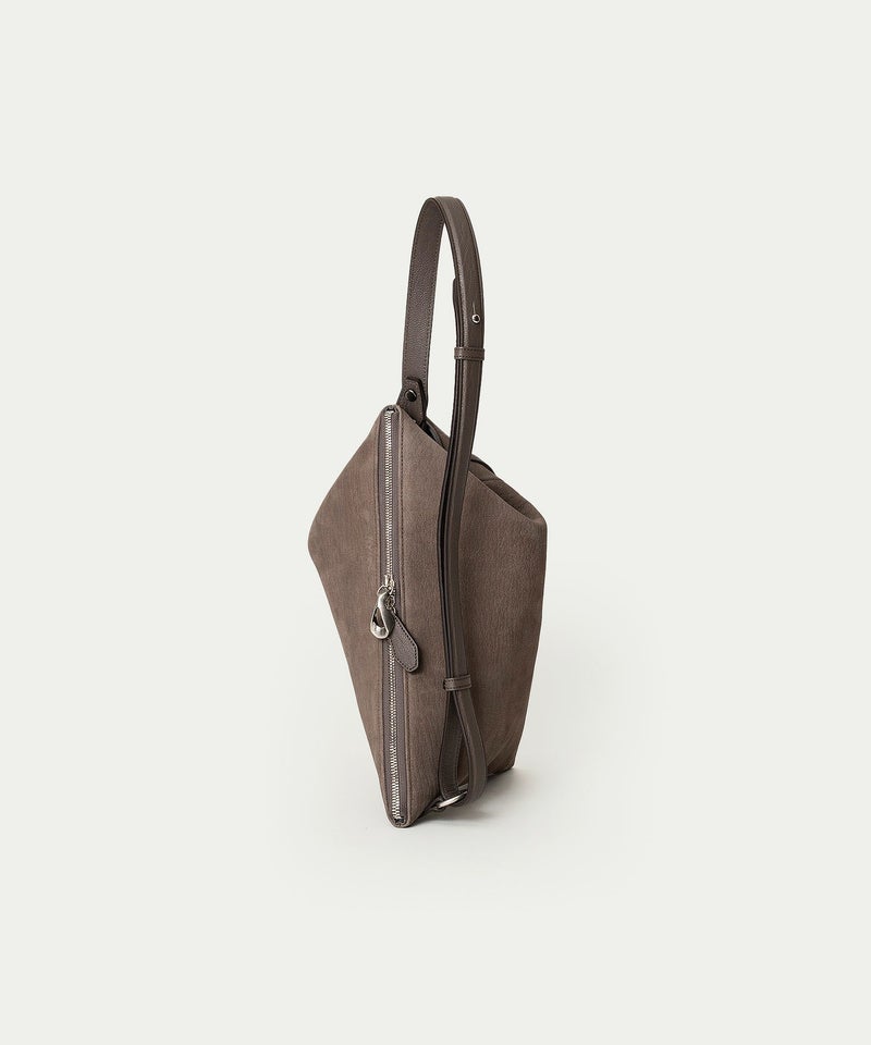 しっとりとした手触りと上品な起毛感が魅力で、牛革より軽く表面に撥水加工を施したゴートレザー「ヌバック」のボディは、柔らかく程よいハリの芯材により型崩れしにくく、キレイな形状を長く保てるのも特長。ハギ(繋ぎ目)は、前面のセンターではなく両サイドの斜めに入れることで菱形を創り出し、エレガントな印象を演出しています。ゴートレザーのショルダーベルトは、4段階の長さ調整が可能。いちばん短くすると手持ちや肩掛けができ、他の3段階は斜め掛けができるので、気分やシーンに合わせて使い分けられます。