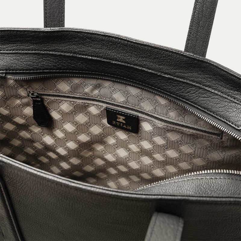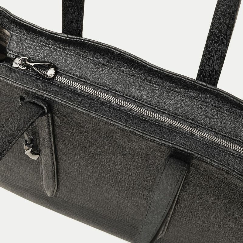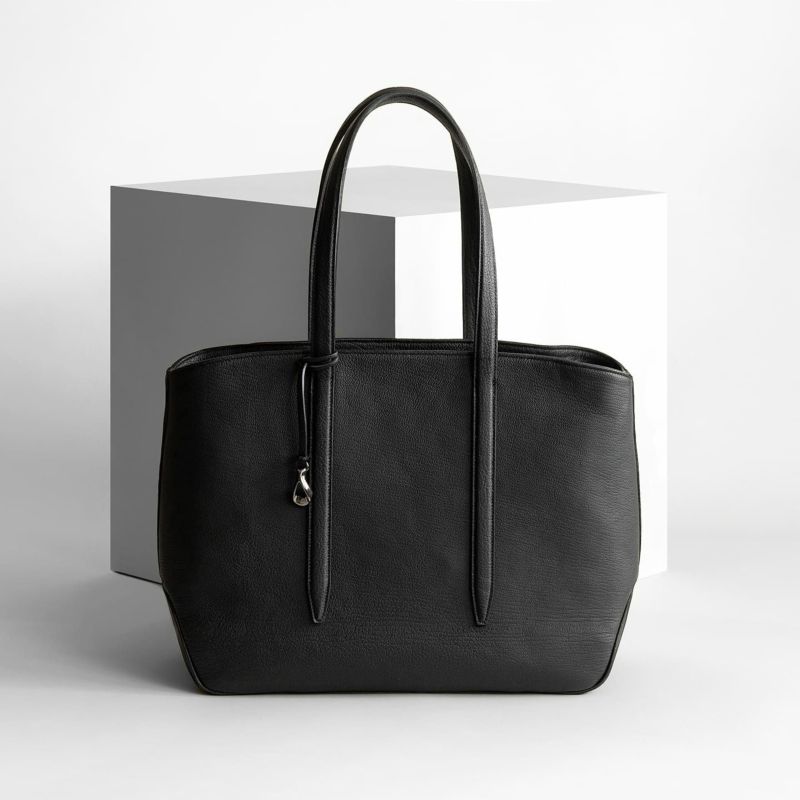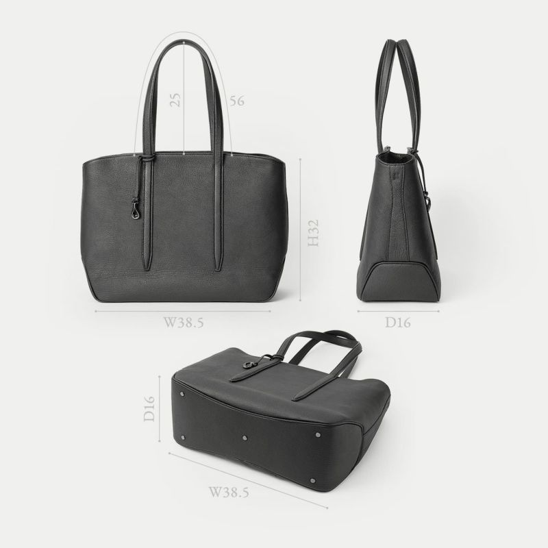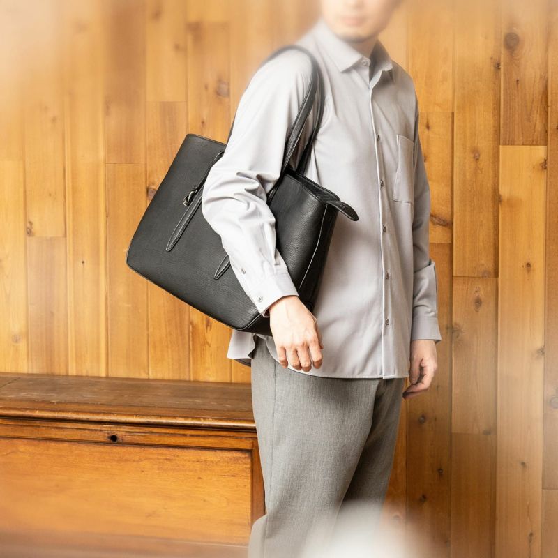 ソフトで馴染みやすい仕上がりで、ビジネスにもプライベートにも柔軟に使える、B4サイズを収納可能なファスナー開閉式のトートバッグ。会社への出勤やカフェでのリモートワークには、ノートパソコンなどを収納・携帯するために大容量が必要ですが、休日などで収納・携帯する物が少ないときには、マチを内側に折り畳んでコンパクトにすることができ、2通りのシルエットを用途に合わせて自由に楽しめるのも魅力です。