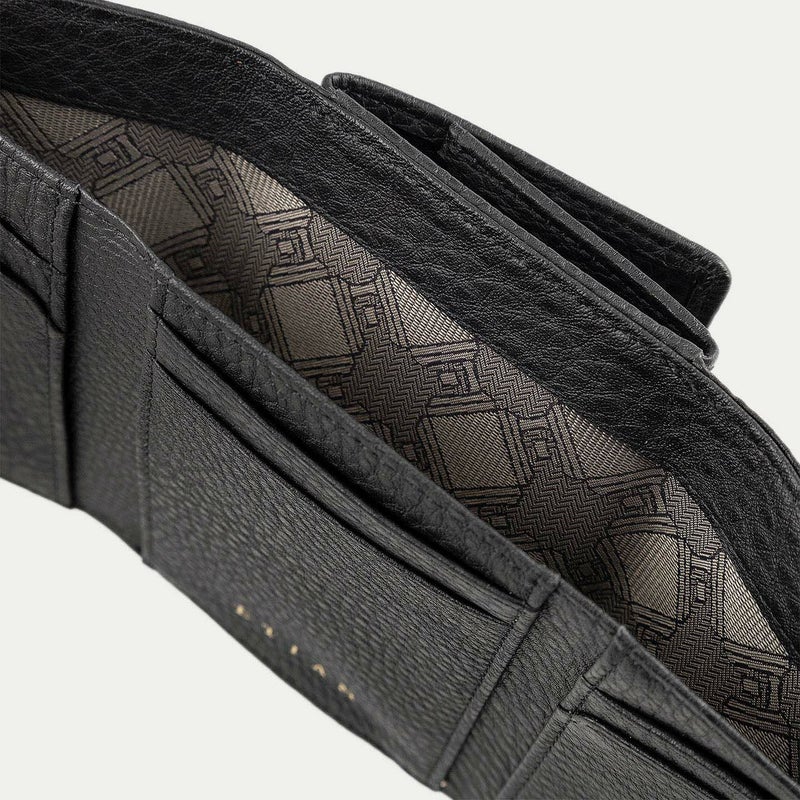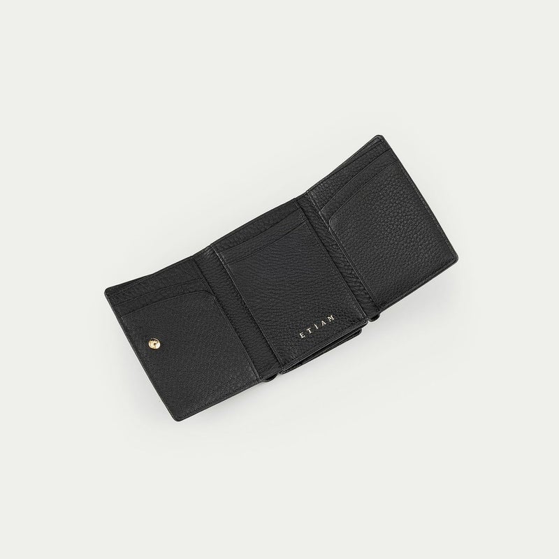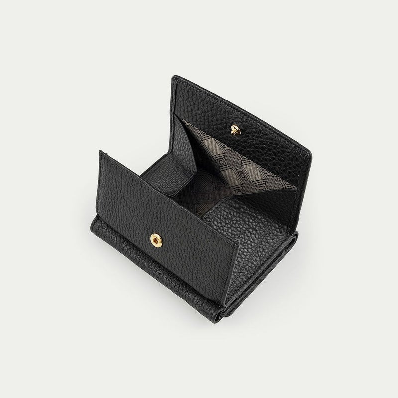 外装・内装に採用している「シュリンクレザー」は、エレガントなシボ感とともに、弾力のある柔らかな質感が特長で、厚みのある三つ折り構造ながら手に馴染みやすく快適。三つ折りの両端や小銭入れのカブセ先端に、緩やかな曲線を施すことで、優雅なシルエットを創出しています。
