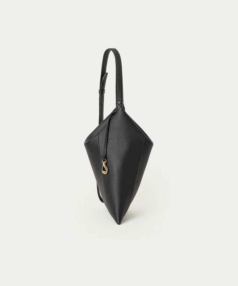 まるで幾何学模様の頂点をイメージさせるようなシャープなフォルムが、何気ない日常の装いに印象的な存在感を添えてくれる、トライアングルショルダーバッグ。ボディとショルダーベルトの接続用に開発したオリジナル金具が、たわみが美しい巾着のような独特のシルエットを生み、トライアングルを想わせる端正なラインを描き出しています。