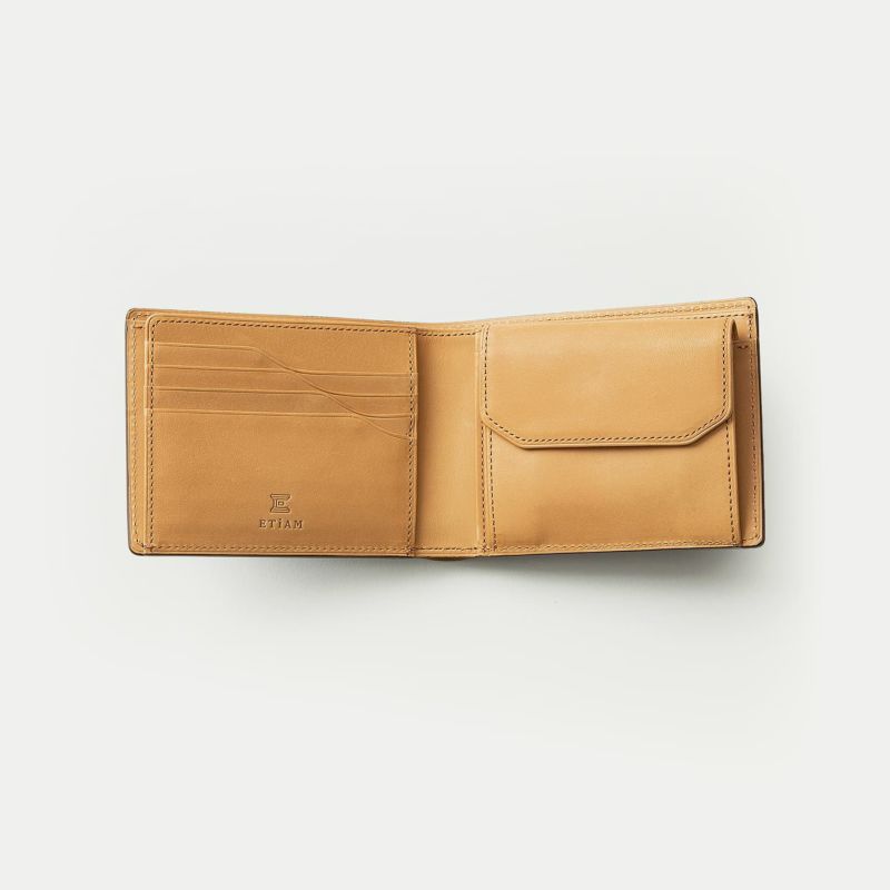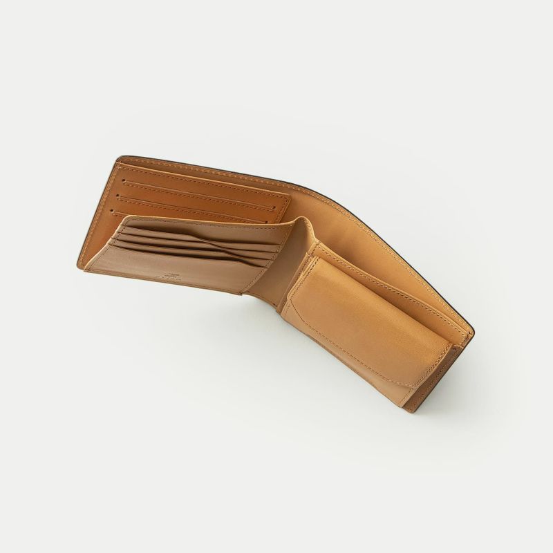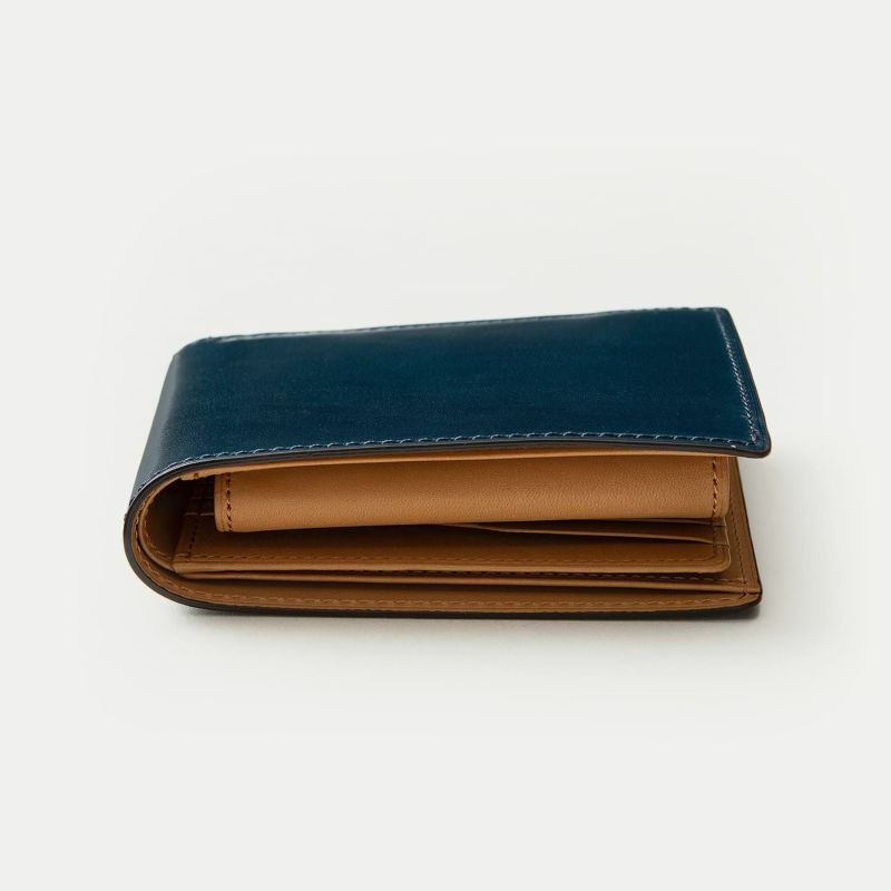 ファンダメンタルな普遍性と、ファッショナブルな独創性を併せ持つバッグブランドによる、時代や流行さえも超えていく新たな魅力を放つ二つ折り財布。“革のダイヤモンド”とも称される外装の「コードバン」は、趣のある重厚な風合いと深みのある上質な色合いへと導かれ、透明感のある美しい光沢を纏うとともに、丁寧なコバの仕上げもその品格を高めています。