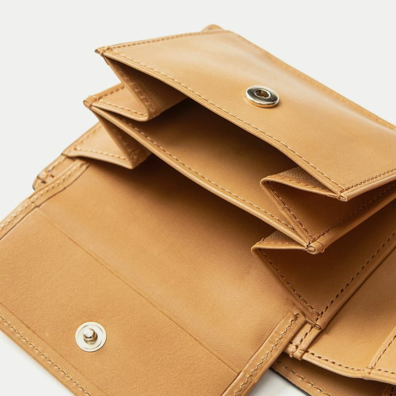 きめ細やかで滑らかな内装の「カーフ」は、適度な弾力によるナチュラルなタッチ感が抜群で、心地よく使うことができることも愛着感へ。また、紙幣の出し入れをスムーズにするダブルアオリ構造の札入れや、仕切り付きで仕分けができるホック開閉式の小銭入れ、波紋を連想させる美しいカッティングのカードポケット4つ、札入れの仕切りのように設けた切り込み式のカードポケット3つのように、使いやすい機能性とデザイン性が凝縮されています。