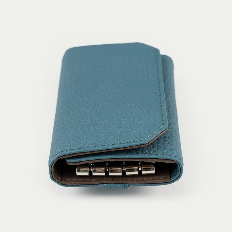 ナチュラルなシボが外装を飾る、ドイツ・ベリンガー社製「シュランケンカーフ」の薄さにもこだわるなど、三つ折りタイプながらスリムなフォルムを追求しているキーケース。薄くしても鞣しが優れているので、もっちりとした柔らかな弾力による触り心地が損なわれないのも魅力です。自動車の車種などにより異なる鍵の大きさに対応するために、メインの二重リングは外装に装備させ、キーリング4つを内装に備えた設計。その内装の素材としても牛革を採用し、上質な贅沢感を演出しています。