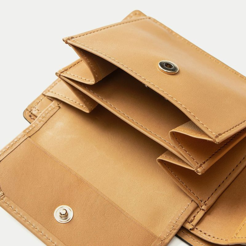 きめ細やかで滑らかな内装の「カーフ」は、適度な弾力によるナチュラルなタッチ感が抜群で、心地よく使うことができることも愛着感へ。また、紙幣の出し入れをスムーズにするダブルアオリ構造の札入れや、仕切り付きで仕分けができるホック開閉式の小銭入れ、波紋を連想させる美しいカッティングのカードポケット4つ、札入れの仕切りのように設けた切り込み式のカードポケット3つのように、使いやすい機能性とデザイン性が凝縮されています。