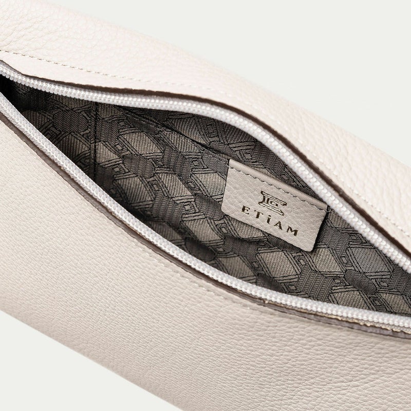 ソフトな心地よさで体にフィットして、調和するように密着しながら肩掛けできる、柔らかいクッションのような横型ショルダーパック。コンパクトながらも長財布を収納できるサイズ感で、ちょっとしたお出掛けに必要な貴重品を携えられます。また、内縫いの構造にするとともに、メインポケットの開口を上部ではなく背面にすることで、ふっくらとした印象のボディを強調。背面のファスナーにおいても、金属ではなくコイルファスナーを採用し、メイン素材である「シュリンクレザー」で覆うことで、カジュアル過ぎないルックスと洋服を摩擦で痛めない配慮を施しています。