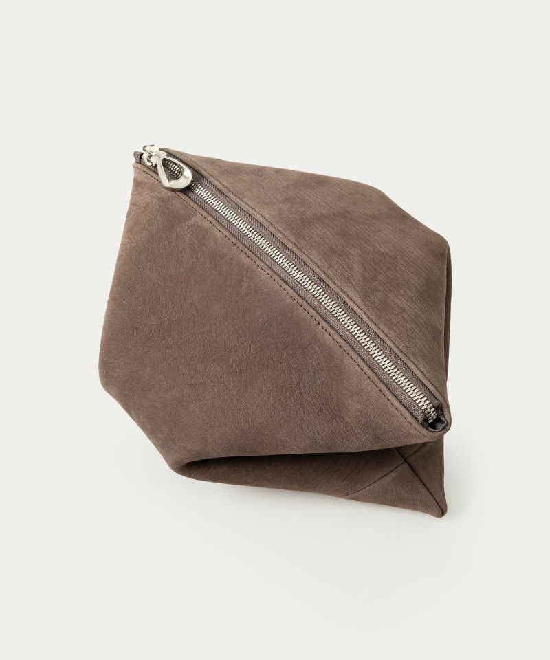 しっとりとした手触りと上品な起毛感が魅力で、牛革より軽く表面に撥水加工を施したゴートレザー「ヌバック」のボディに、柔らかくて程よいハリのある芯材を用いることで、型崩れしにくくキレイな形状のまま長く使いこなせるのも魅力。ハギ(繋ぎ目)は、前面センターに入れるのではなく、あえて両サイド斜めに設けることで、上部の三角形を生かした菱形のエレガントな印象へ。ゴートレザーのストラップは、接続金具を軸にフレキシブルに回転し、軽やかに手首に通して持ち歩くことができます。