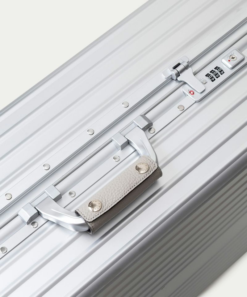 本体の素材には、高品質なアルミニウム合金〈5052-H32〉を採用。建築外装材・ノートPCなどにも使用される信頼性の高さと、耐食性・成形性・軽量性に優れているのが特長です。アルミニウム加工に特化した工場で、フレーム・ボディそれぞれを専用機械で精密に成形。平面1枚のアルミ板から、プレス・切り出し・成形する工程を経て、一体感のある美しいフォルムへと仕上げています。そして、洗練された輝きを放つ柔らかな曲線と上品な光沢による、クラシックな佇まいと存在感が、旅のスタイルを格上げするように演出。使い込むほどに刻まれる小さな凹みやキズは、ETiAMのバッグにも使われている「シュリンクレザー」のハンドルカバーやネームタグとともにに、味わいを増しながら思い出深く育っていくのも魅力です。