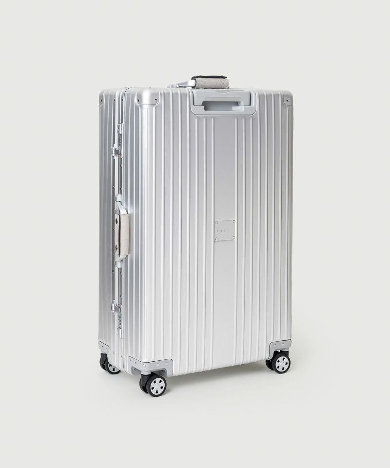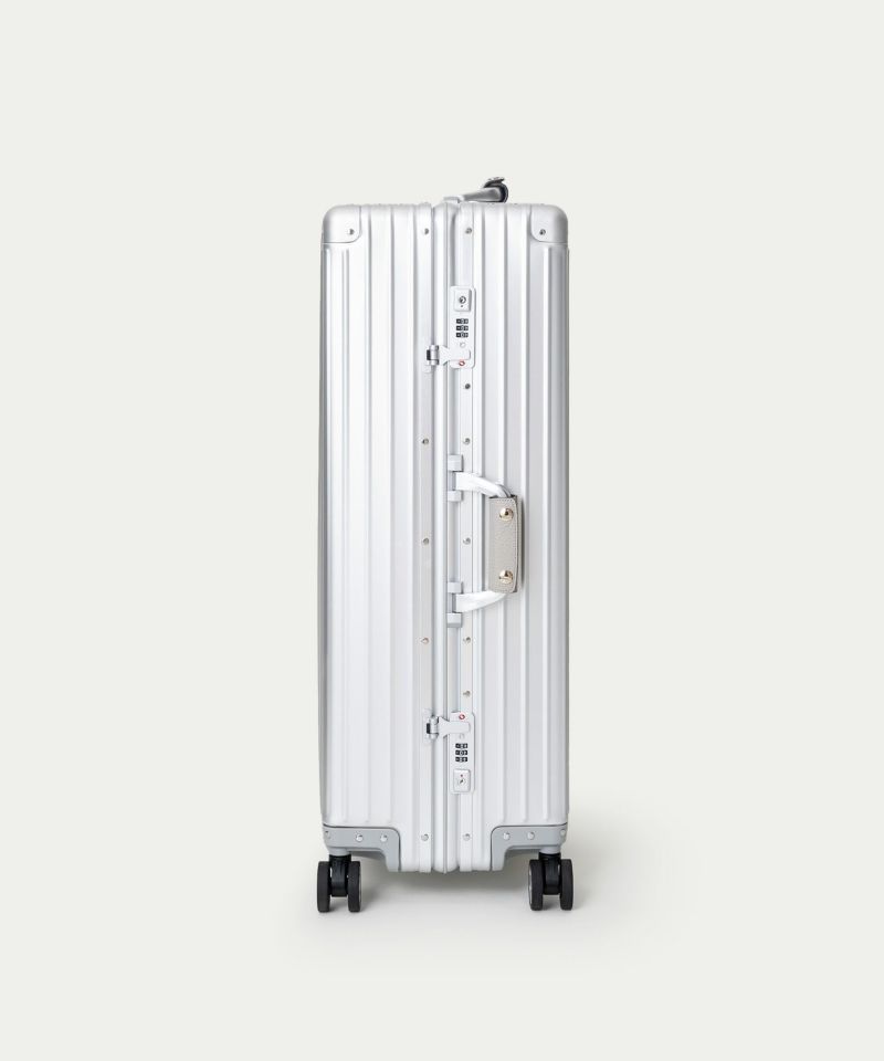 本体の素材には、高品質なアルミニウム合金〈5052-H32〉を採用。建築外装材・ノートPCなどにも使用される信頼性の高さと、耐食性・成形性・軽量性に優れているのが特長です。アルミニウム加工に特化した工場で、フレーム・ボディそれぞれを専用機械で精密に成形。平面1枚のアルミ板から、プレス・切り出し・成形する工程を経て、一体感のある美しいフォルムへと仕上げています。そして、洗練された輝きを放つ柔らかな曲線と上品な光沢による、クラシックな佇まいと存在感が、旅のスタイルを格上げするように演出。使い込むほどに刻まれる小さな凹みやキズは、ETiAMのバッグにも使われている「シュリンクレザー」のハンドルカバーやネームタグとともにに、味わいを増しながら思い出深く育っていくのも魅力です。