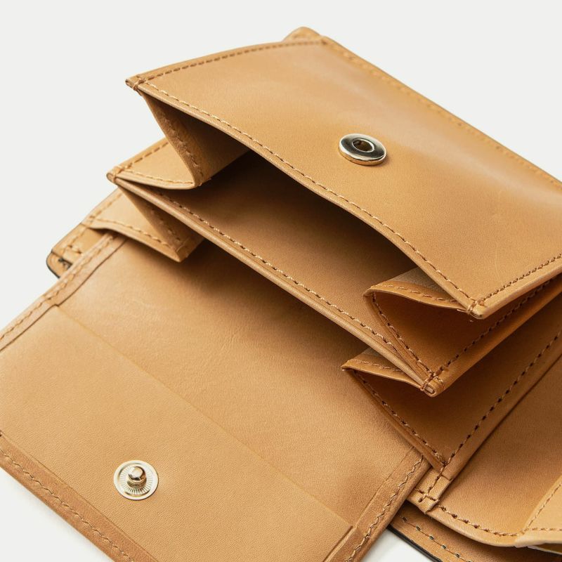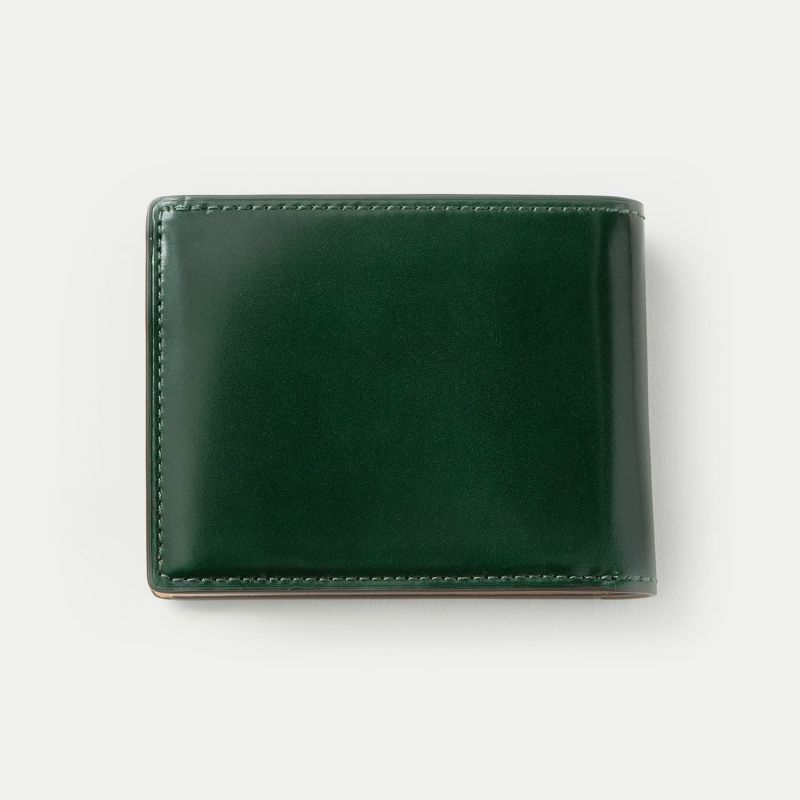 ファンダメンタルな普遍性と、ファッショナブルな独創性を併せ持つバッグブランドによる、時代や流行さえも超えていく新たな魅力を放つ二つ折り財布。“革のダイヤモンド”とも称される外装の「コードバン」は、趣のある重厚な風合いと深みのある上質な色合いへと導かれ、透明感のある美しい光沢を纏うとともに、丁寧なコバの仕上げもその品格を高めています。