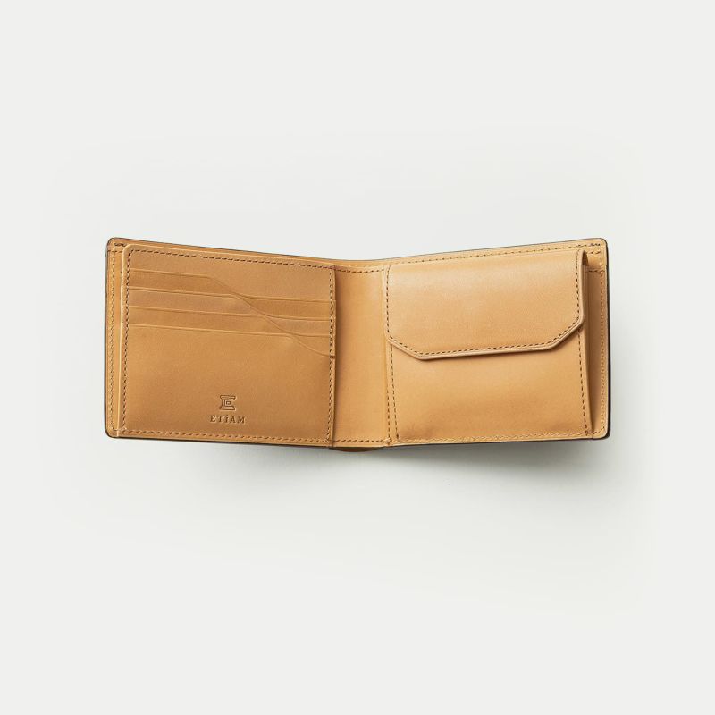 きめ細やかで滑らかな内装の「カーフ」は、適度な弾力によるナチュラルなタッチ感が抜群で、心地よく使うことができることも愛着感へ。また、紙幣の出し入れをスムーズにするダブルアオリ構造の札入れや、仕切り付きで仕分けができるホック開閉式の小銭入れ、波紋を連想させる美しいカッティングのカードポケット4つ、札入れの仕切りのように設けた切り込み式のカードポケット3つのように、使いやすい機能性とデザイン性が凝縮されています。