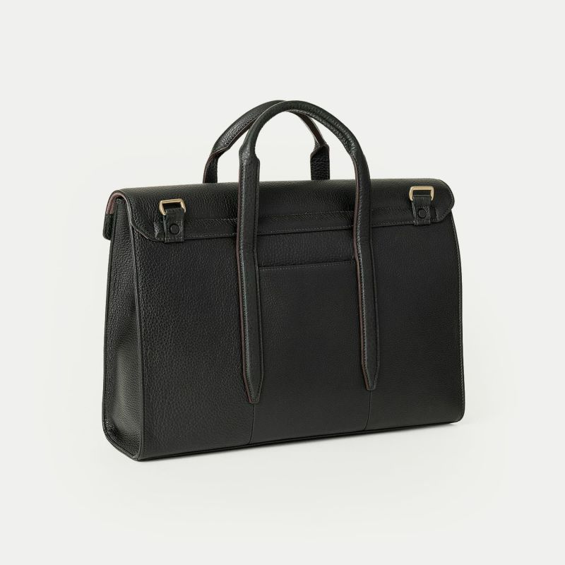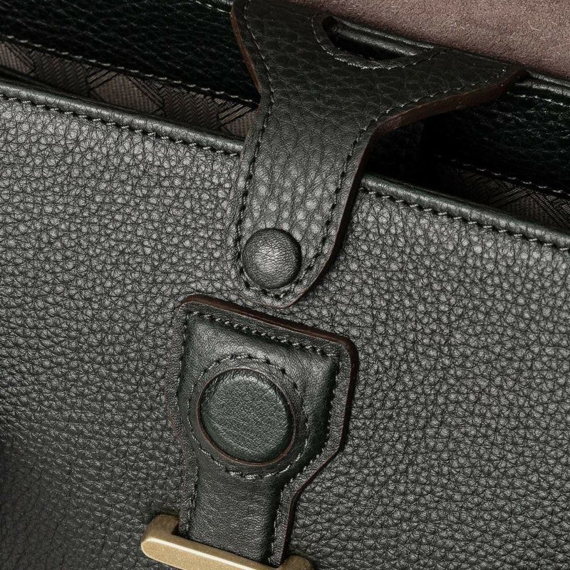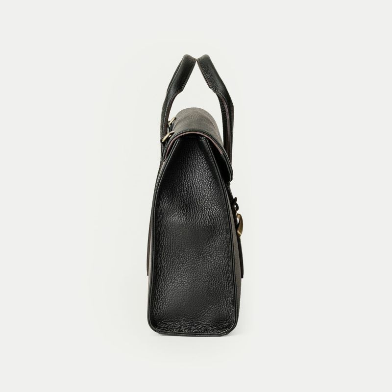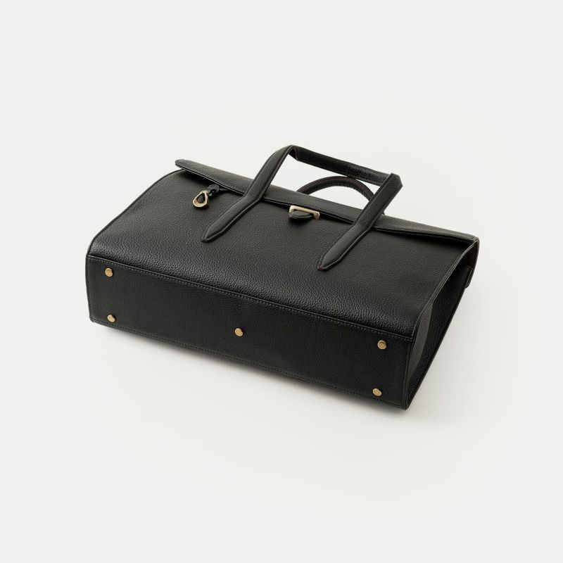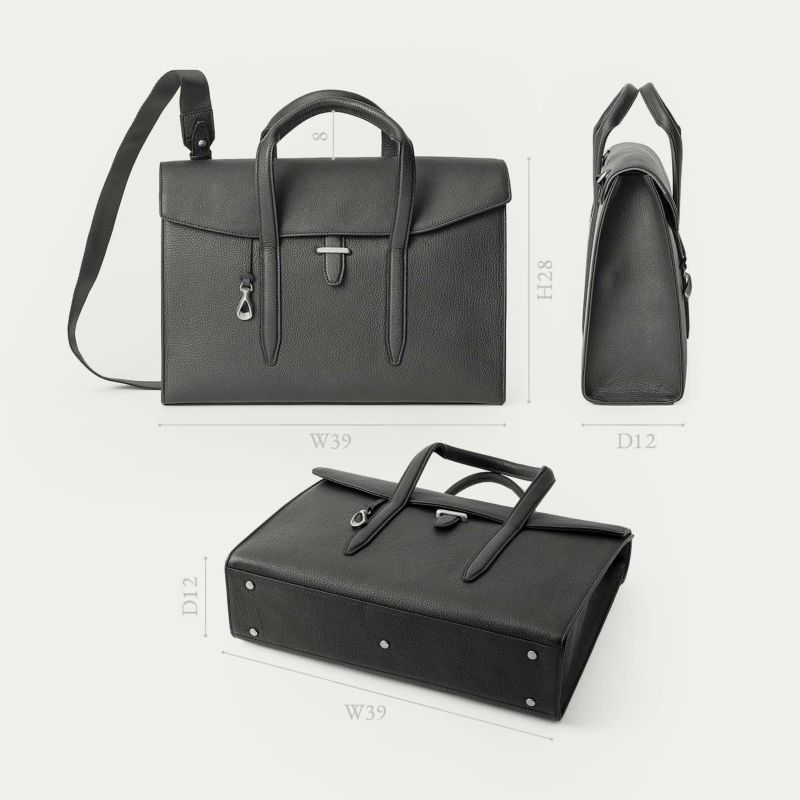 伝統的な趣があるフラップを備えた、バッグの基礎のようなシルエットが美しい、クラシカルなデザインのブリーフケース。ジャケットの襟をイメージしたフラップは、直線すぎないラインで、程よい丸みのカーブを描くとともに、革よりも裏地を短くすることで、ふんわりとした立体感も表現しています。また、フラップのアクセントでもある、中央のベルト&差し込み金具は、イミテーションにしてマグネット式を採用することで、簡単に開き閉めすることが可能。つねに立っている設計のハンドルは、すぐに持ち上げやすい機能性と見た目がスタイリッシュなデザイン性を併せ持ち、握る部分を二つ折りにして持ちやすくしています。