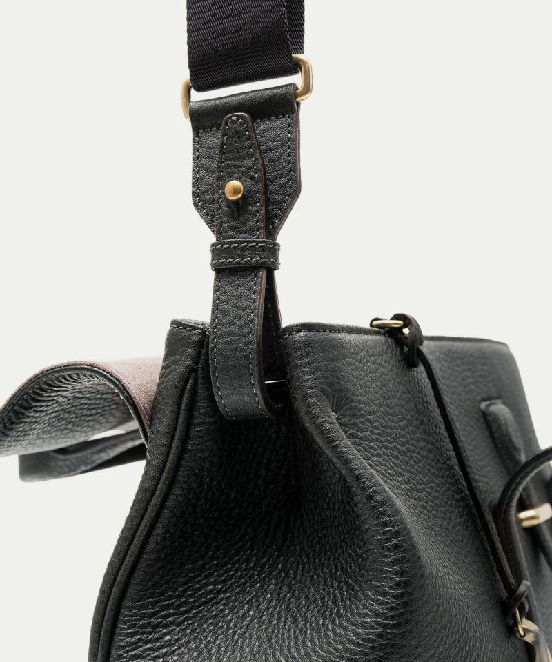 クラシカルな印象で重厚感あふれるフラップは、マグネット式を採用して、素早く開閉できる利便性を追求。マチ上部に設けたショルダーベルトの付け根金具は、均等に重さが分散される安定した構造でバッグの歪みを防ぐとともに、ベルトを外していても見えにくく洗練されたアクセントに仕上げています。